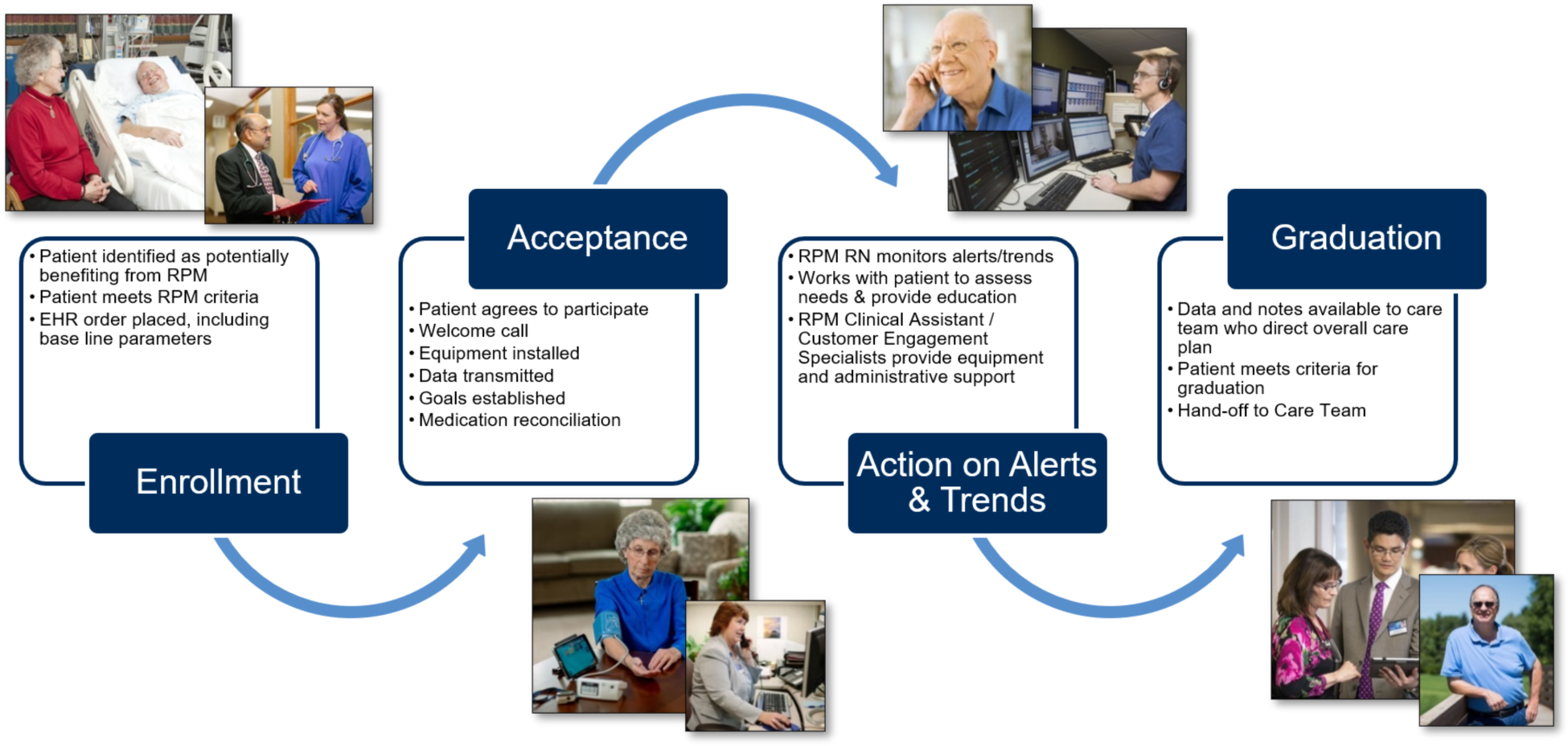 Mayo Clinic developed a nurse-led RPM program for disease and post-procedural management to improve patient experience, clinical outcomes, and reduce health care utilization by more directly engaging patients in their health care. Enrolled patients are sent a technology package that includes a digital tablet and peripheral devices for the collection of symptoms and vital signs. The data are transmitted from to a hub integrated within the electronic health record. Care team members coordinate patient needs, respond to vital sign alerts, and utilize the data to inform and provide individualized patient assessment, patient education, medication management, goal setting, and clinical care planning.