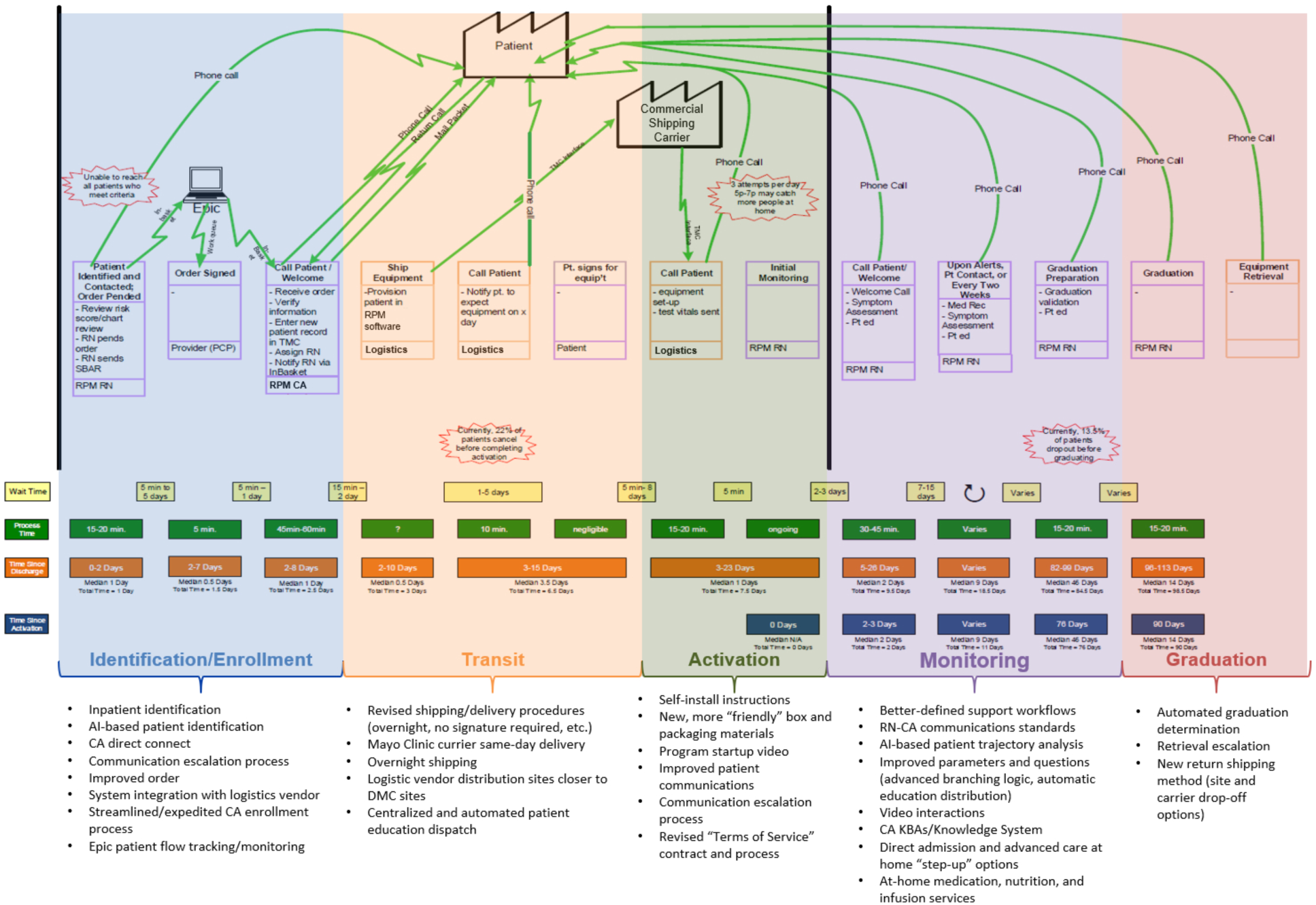 Mayo Clinic is a not-for-profit group practice with integrated research, education, and clinical practice activities with over 5 million outpatient visits annually across a multi-campus environment spanning five states (52, 53). In early 2015, remote monitoring offerings existed as isolated projects and research studies within the institution. These services were fragmented, non-standardized, nor scalable (54). To address this, an “Area of Excellence” with centralized program management was developed to establish clear governance and oversight, standardize clinical practice and reporting, and coordinate partner and vendor relationships (55).