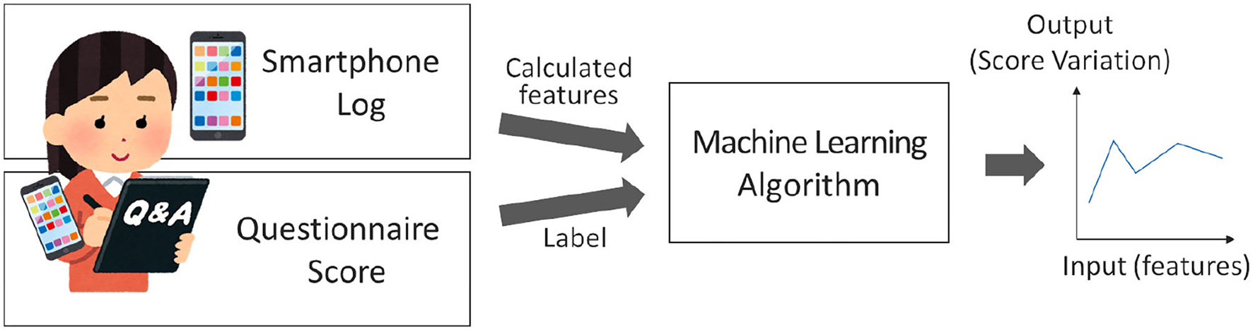 The outline of the model proposed in this study is shown in Figure 1. First, the experiment was conducted, and the participants responded to the questionnaires. During the experiment, a smartphone log collection application installed in the participants' smartphones continually collected smartphone logs. Scores were calculated from the answers to the questionnaire, and labeling was conducted. From the collected smartphone logs, features were constructed on a daily and weekly basis. Based on the set of labels and features, estimation models were constructed using the machine learning algorithm.