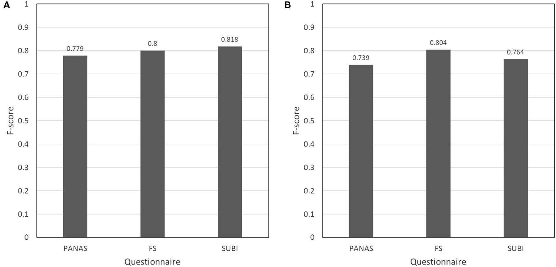 To evaluate the performance of each estimation model, F-score was calculated based on the estimation results (Figure 3). The F-score of the fluctuation model was 0.779 for the PANAS, 0.800 for the FS, and 0.818 for the SUBI (Figure 3A). The F-score of the interval model was 0.739 for the PANAS, 0.804 for the FS, and 0.764 for the SUBI (Figure 3B).