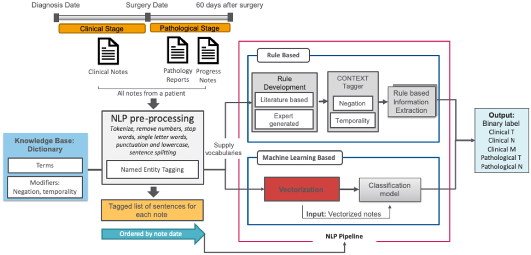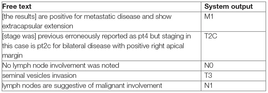 Firstly, all related clinical terms were identified using staging guidelines from the American Joint Committee on Cancer (AJCC, 7th edition) and our expert urologists' recommendations. These clinical terms were used as the target terms by the rule-based algorithm. Those target terms are often modified by several contextual properties relevant to our information extraction task; ConText (20) identifies three contextual values—hypothetical, historical, and experiencer—in addition to negation via NegEx. We implemented ConText within the NLP system to determine whether a stage entity is negated and its temporal status.