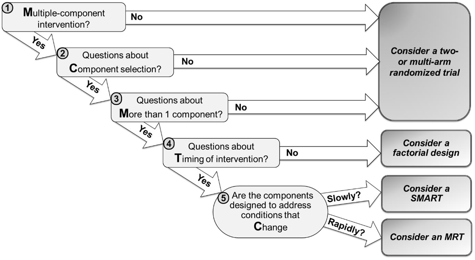 Various types of experimental approaches have been developed in recent years to enable researchers to obtain the empirical evidence necessary for the development and/or evaluation of effective multiple-component interventions. These include standard two- or multi-arm randomized trials [e.g., randomized controlled trials (RCTs)], factorial designs (11, 12), Sequential Multiple Assignment Randomized Trials [SMARTs (13, 14)], and Micro-Randomized Trials [MRTs (15, 16)]. An important challenge facing researchers interested in developing digital interventions concerns the selection of an appropriate experimental design to achieve their scientific goals. Here, we propose MCMTC, a pragmatic framework that can be used to guide investigators interested in developing digital interventions in deciding which experimental approach to select based on their scientific questions. MCMTC can be used not only as a guide for investigators considering potential studies, but also as a framework for teaching students the practical differences between various experimental design options.