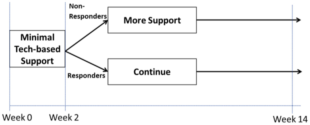 Examples where the answer to Question 5 may be “slowly” include cases where investigators are interested in developing an adaptive intervention (ADI) and they need to answer questions about the selection and adaptation of components in this intervention. ADIs are interventions that use dynamic (time-varying) information about the person's progress in the course of an intervention (e.g., early response status, adherence) to decide which intervention component to deliver at different decision points (22, 23). Each decision point represents a point in time in which a decision should be made in practice about whether and how to modify the intervention based on what is known about the individual's status and progress. Here, the term “adaptation” refers to the use of dynamic information about the person to decide whether and how to intervene. In the hypothetical example in Figure 2, information about response status (operationalized in terms of whether or not the individual self-reported tobacco use within the past 7 days) is used to decide who should be offered more support and who should continue with the initial intervention. This adaptation process is initiated at week 2 because it is intended to address early signs of non-response, which are expected to unfold (in this example) over 2 weeks. The underlying assumption is that offering more support to those who show early signs of non-response at week 2 would prevent their likely failure to achieve long-term abstinence, whereas those who show early signs of response at week 2 are likely to succeed ultimately and hence would benefit from continuing with the same initial intervention.