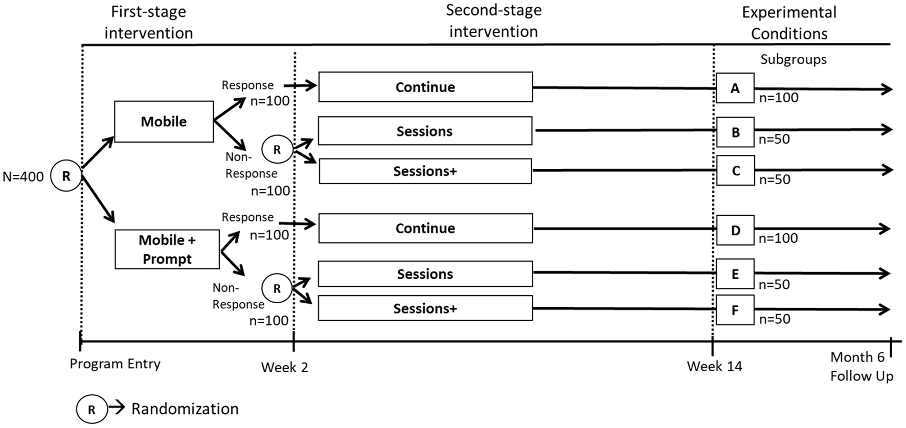 A SMART is a randomized trial that includes sequential randomizations (13, 14); that is, some or all of the study participants are randomized more than once in the course of the study (31). Each randomization in a SMART is designed to answer scientific questions about the selection and adaptation of components at a specific decision point with the goal of empirically informing the development of an ADI. Consider again the two scientific questions outlined in Example C. The first question about which component to offer at week 0 can be answered by randomizing individuals at week 0 to either Mobile or Mobile+Prompt. The second question about which component to offer early non-responders at week 2 can be answered by re-randomizing early non-responders at week 2 to either Sessions or Sessions+. Responders do not get re-randomized and instead continue with the initial intervention. These sequential randomizations result in six experimental conditions, labeled A through F (Figure 3).