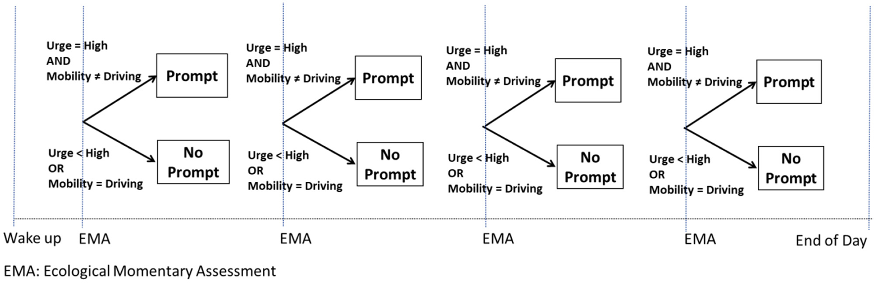As an example (Example D), consider a JITAI for preventing a smoking lapse by delivering a mobile-based prompt [e.g., via a push notification from a mobile app; see (42)] that recommends a self-regulatory strategy when individuals self-report an urge to smoke and are not driving a car. Participants' urge to smoke is monitored via Ecological Momentary Assessments (EMAs) (43) four times per day (triggered at randomly selected times and spread throughout the person's waking hours, with ~3 h between each), and assisted GPS technology is used to track and calculate their minute-by-minute mobility pattern (44–46). If the person self-reports high urge to smoke via the EMA and they are not driving a car, a prompt recommending a brief self-regulatory strategy is delivered on their mobile device. Otherwise, a prompt is not delivered (Figure 4). This intervention is adaptive because it uses dynamic information about the person's internal state (i.e., urge to smoke) and context (i.e., mobility pattern) to decide whether and how to intervene. This intervention is a JITAI because the adaptation is intended to address conditions that change rapidly (urge to smoke may emerge multiple times per day, representing risk for a smoking lapse) based on real-world context (urge to smoke may emerge in the person's natural environment, outside of standard treatment settings). The adaptation in this hypothetical JITAI is intended not only to prevent a smoking lapse (by addressing high urge to smoke) while avoiding unnecessary intervention (not delivering an intervention when urge to smoke is less than high), but also to minimize disruptions to the daily lives of individuals (by not delivering an intervention when the person is driving).
