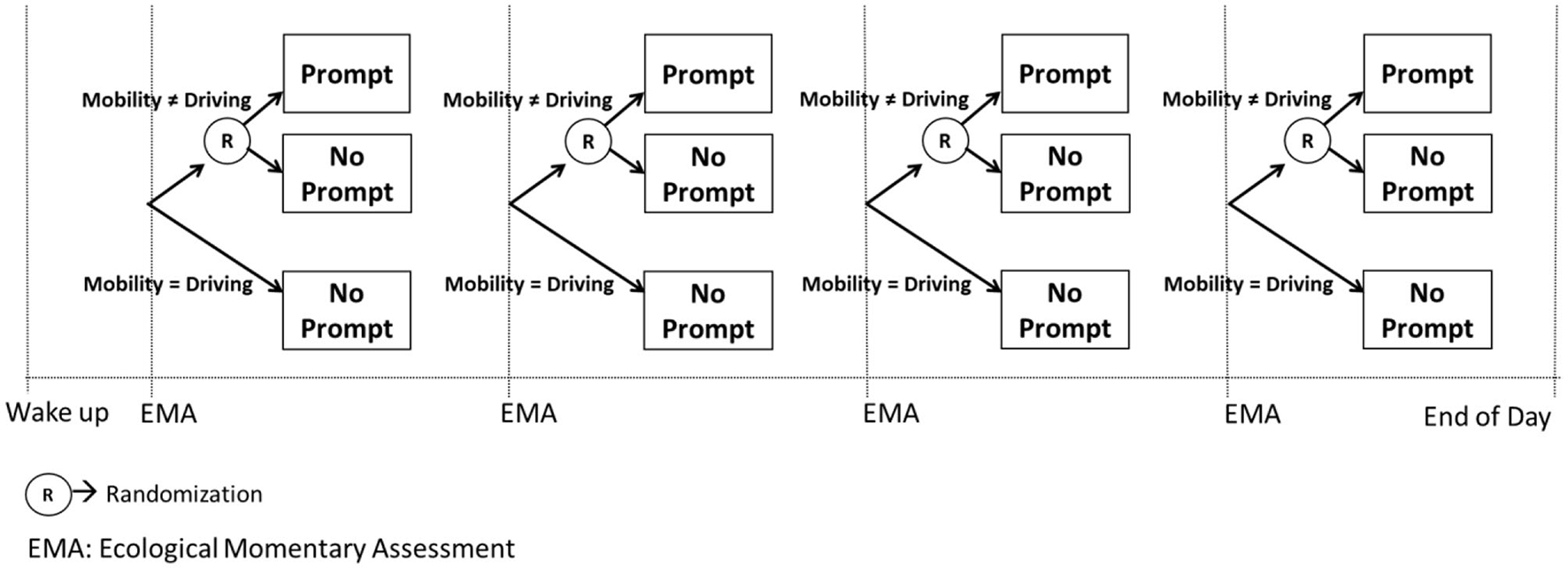 Similar to classic factorial designs and SMART designs, MRTs make extremely efficient use of study participants to answer questions about the selection and adaptation of components in a JITAI. This efficiency is facilitated by capitalizing on both between-subject and within-subject contrasts in the primary outcome (15, 50). For example, consider the first scientific question. Here, the primary outcome is whether or not the person experiences a lapse in the next 3 h. This (binary) outcome is assessed following each randomization. Hence, the first question can be answered by comparing two probabilities: (1) the probability of experiencing a lapse in the next 3 h when the individual was not driving and a prompt was triggered following the EMA, and (2) the probability of experiencing a lapse in the next 3 h when the individual was not driving and a prompt was not triggered following the EMA. This difference can be estimated by pooling data across all study participants and also across all decision points in which the individual was not driving (51). This is an estimate of the (causal) main effect of delivering a prompt (vs. no prompt), at decision points in which the individual is not driving.