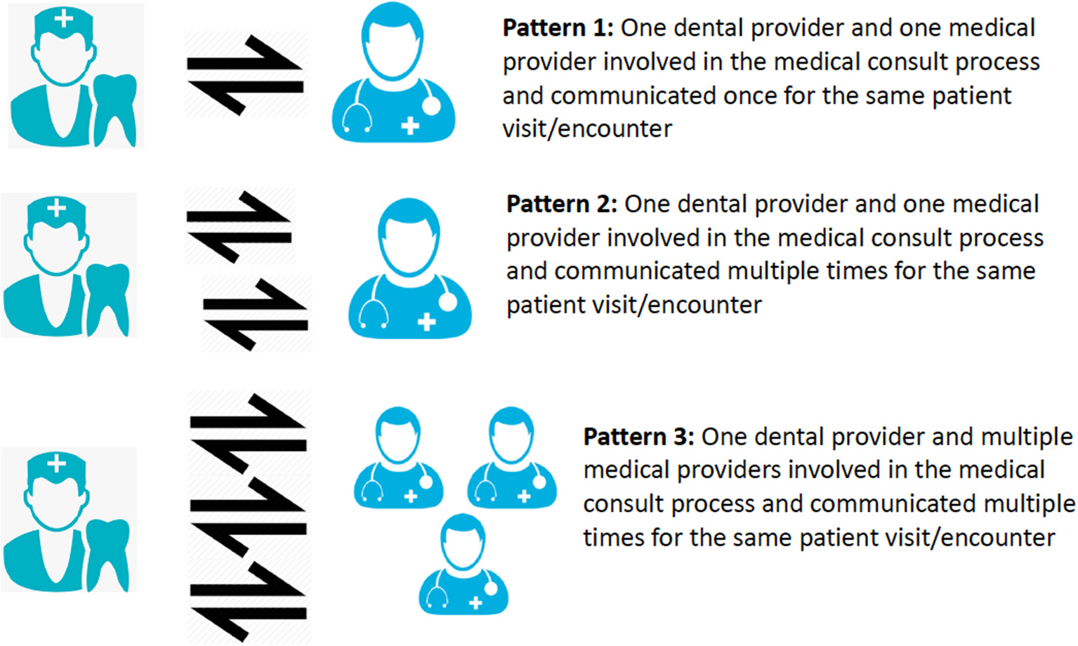 Among the 240 medical consults, 131 consults (55%) followed Pattern 1, a single communication between one dental provider and one medical provider (Figure 2), and 61 (25%) consults involved multiple communications between one dental provider and one medical provider (Pattern 2) to complete the consults. Forty-eight consults (20%) involved one dental provider having multiple communications with more than one medical provider (Pattern 3).