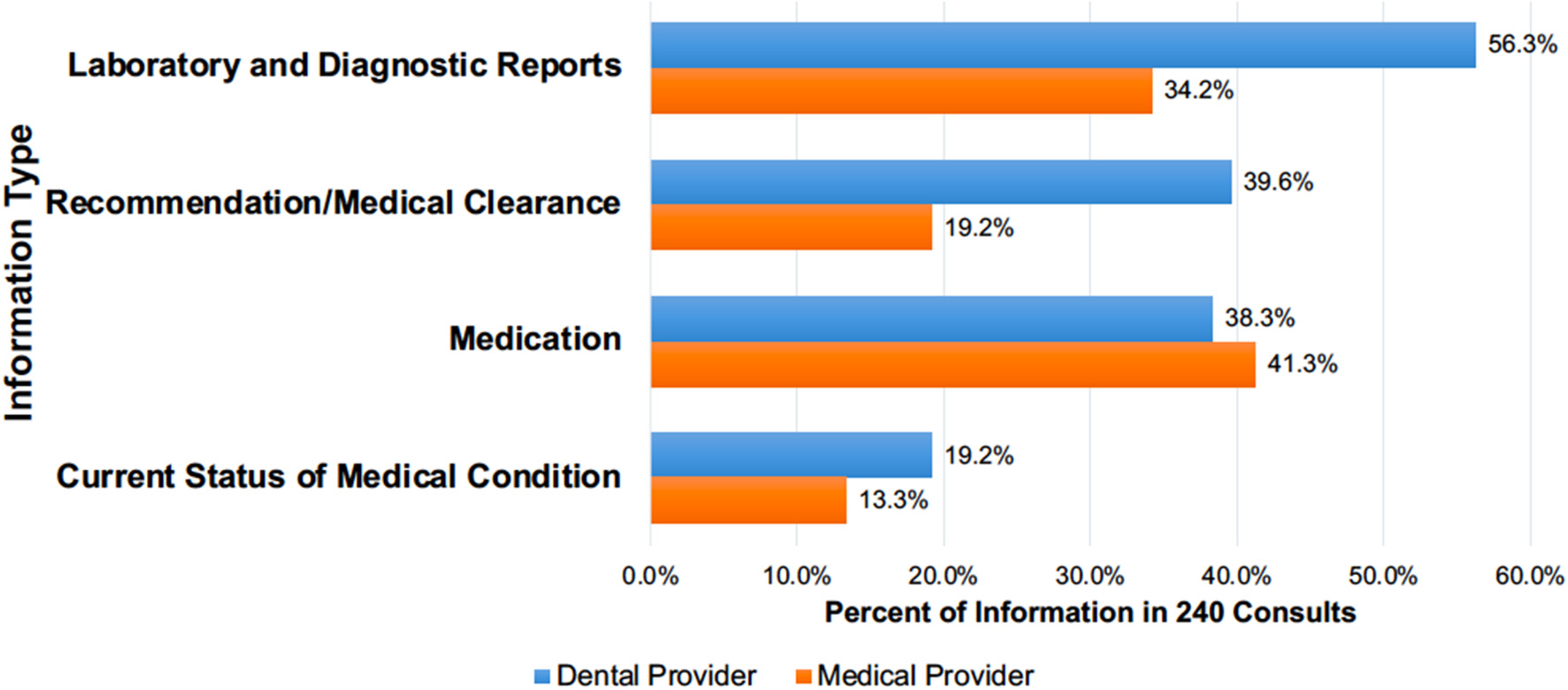 The percentage of different information types* dental providers requested in the 240 medical consults for 179 patients and returned by medical providers (2-column fitting image). *Values do not add up to 240 (or 100%) due to the presence of multiple information requests in one form.