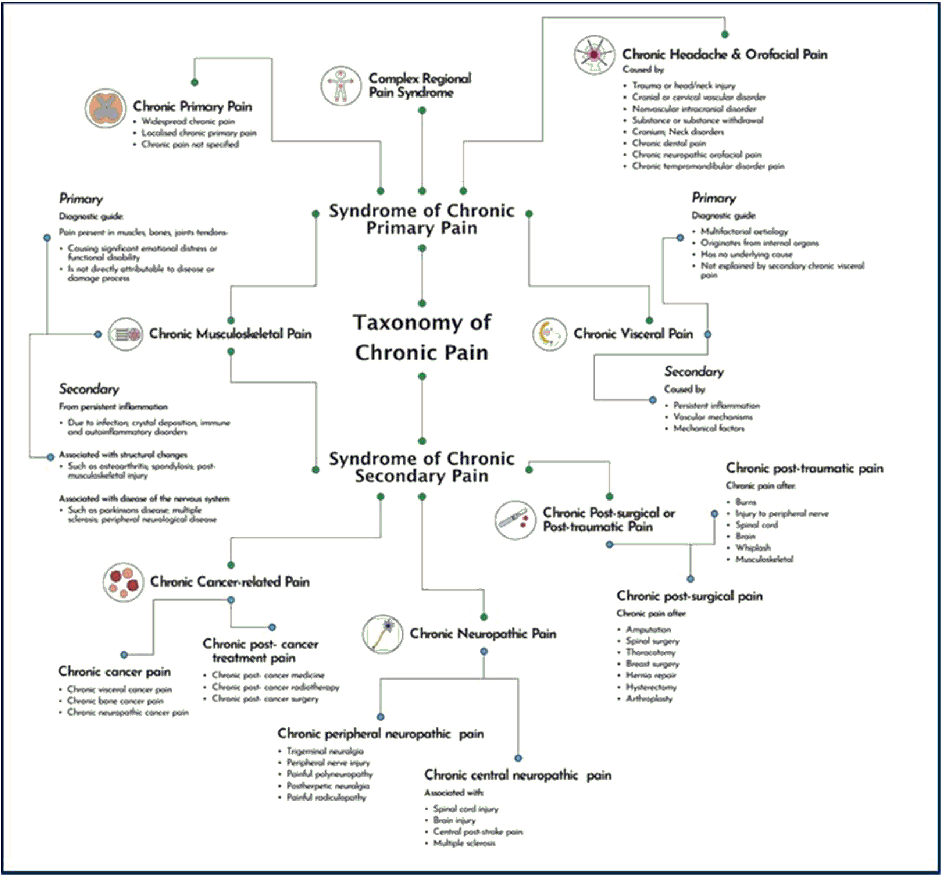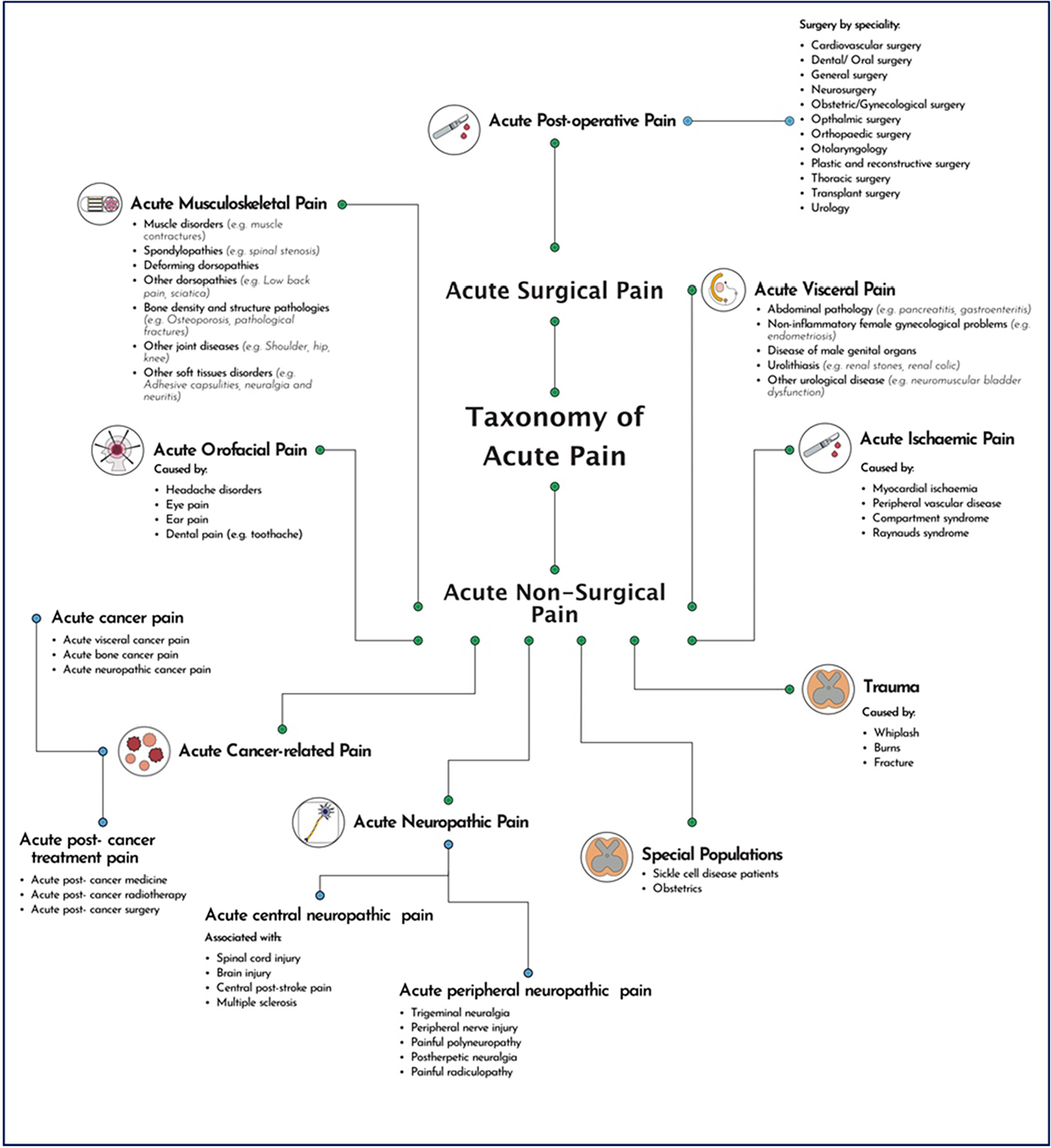 The regulatory and standards required for novel innovations are also dependent on the disease classification. The current classification of chronic and acute pain conditions (Figures 1, 2 respectively) employs the guidelines published by the International Association for the Study of Pain. Clinicians evaluating both chronic and acute chronic pain are considering changes to guidelines to provide better diagnoses and improve outcomes for patients. Advancements in the understanding of the pathophysiology of acute and chronic pain have resulted in effective pharmacological approaches to sub-populations of patients.