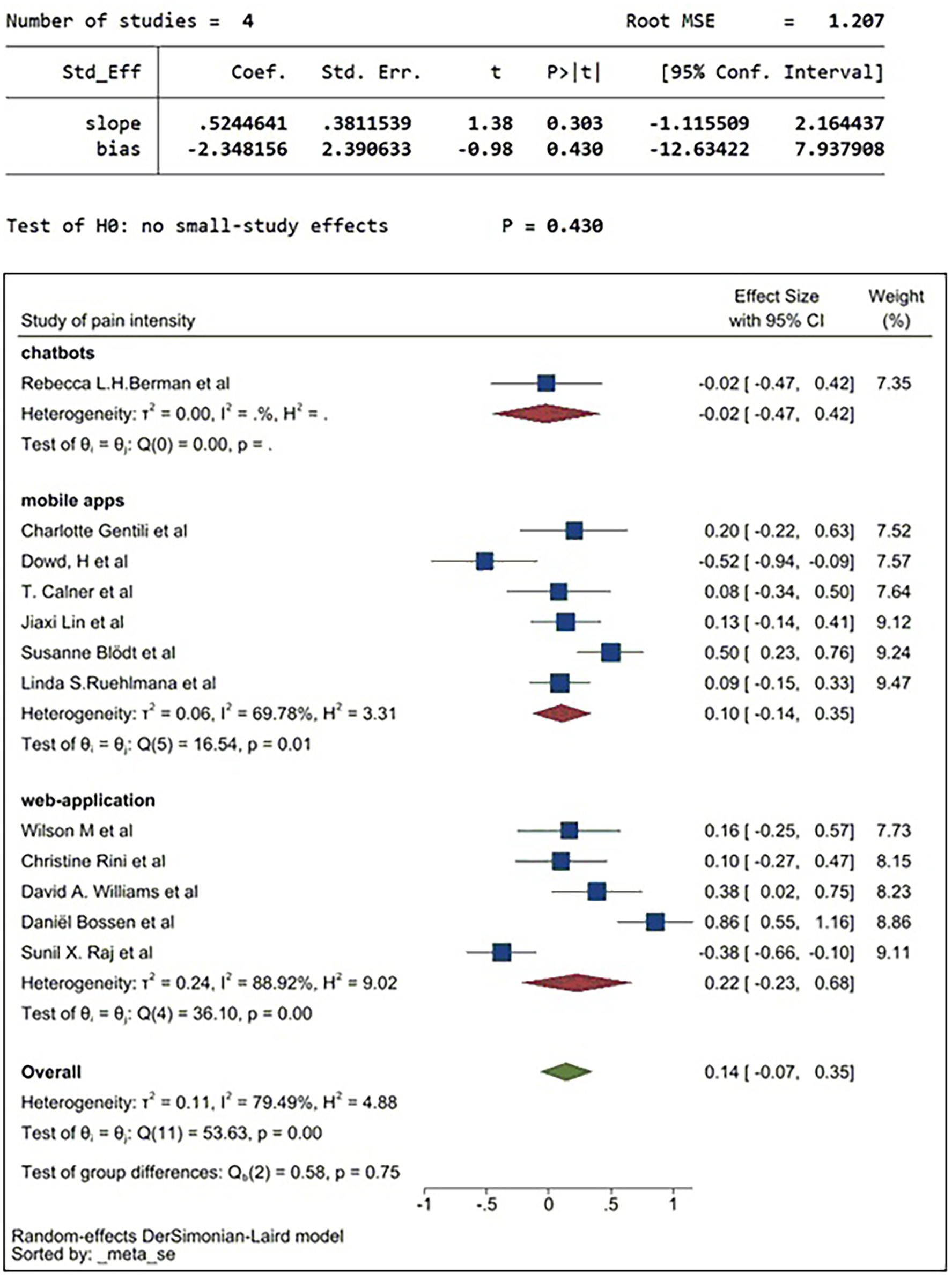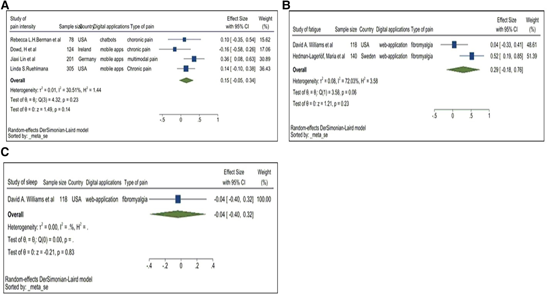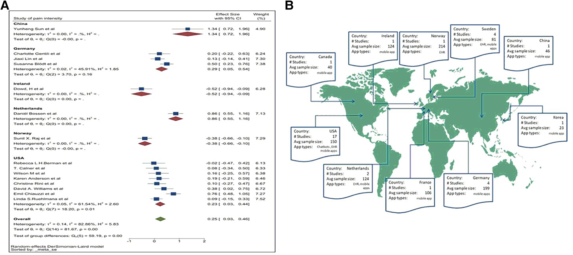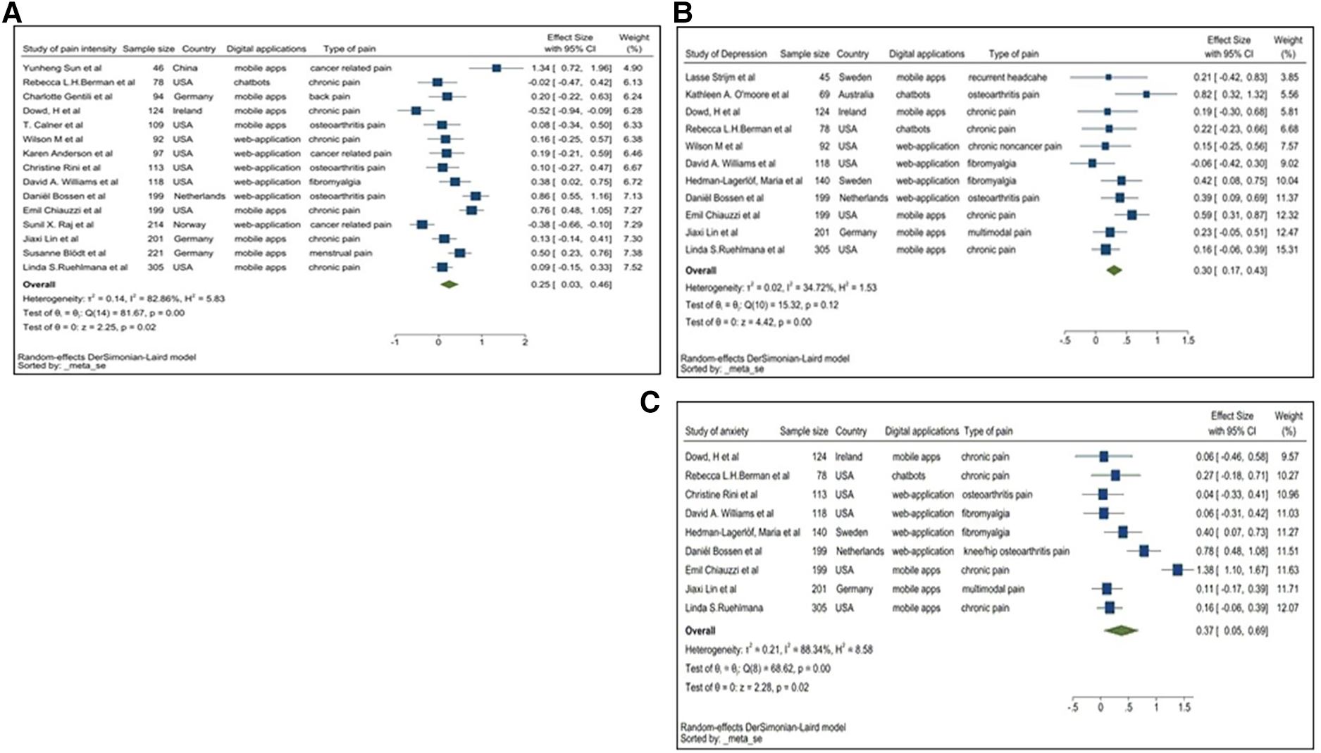 38 studies were included in the systematic review and 22 studies were included in the meta-analysis. The digital interventions were categorised to web and mobile applications and chatbots, with pooled standard mean difference of 0.22 (95% CI: −0.16, 0.60), 0.30 (95% CI: 0.00, 0.60) and −0.02 (95% CI: −0.47, 0.42) respectively. Pooled standard mean differences for symptomatologies of pain intensity, depression, and anxiety symptoms were 0.25 (95% CI: 0.03, 0.46), 0.30 (95% CI: 0.17, 0.43) and 0.37 (95% CI: 0.05, 0.69), respectively. A sub-group analysis was conducted on pain intensity due to the heterogeneity of the results (I2 = 82.86%; p = 0.02). After stratifying by country, we found that digital applications were more likely to be effective in some countries (e.g., United States, China) than others (e.g., Ireland, Norway).