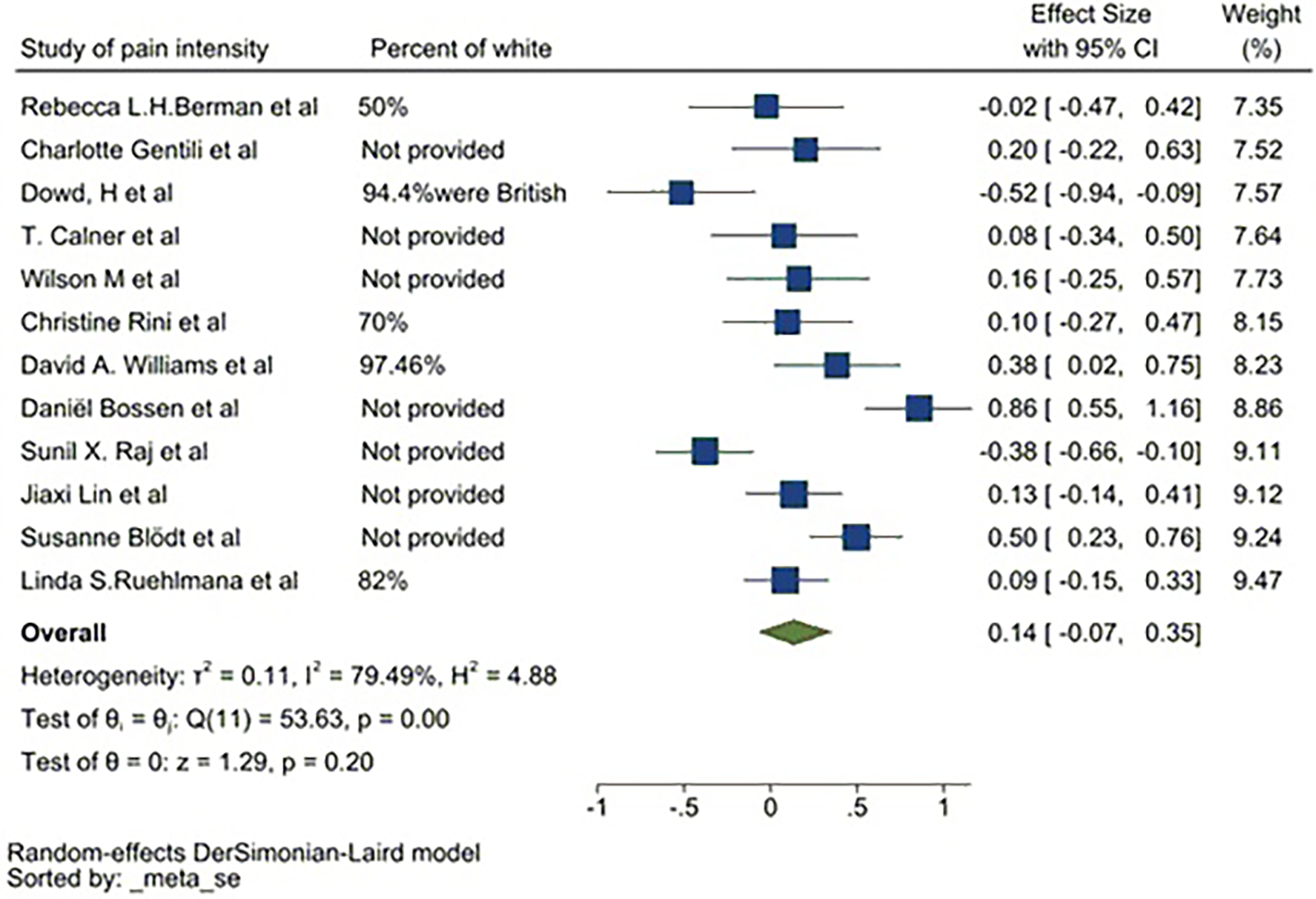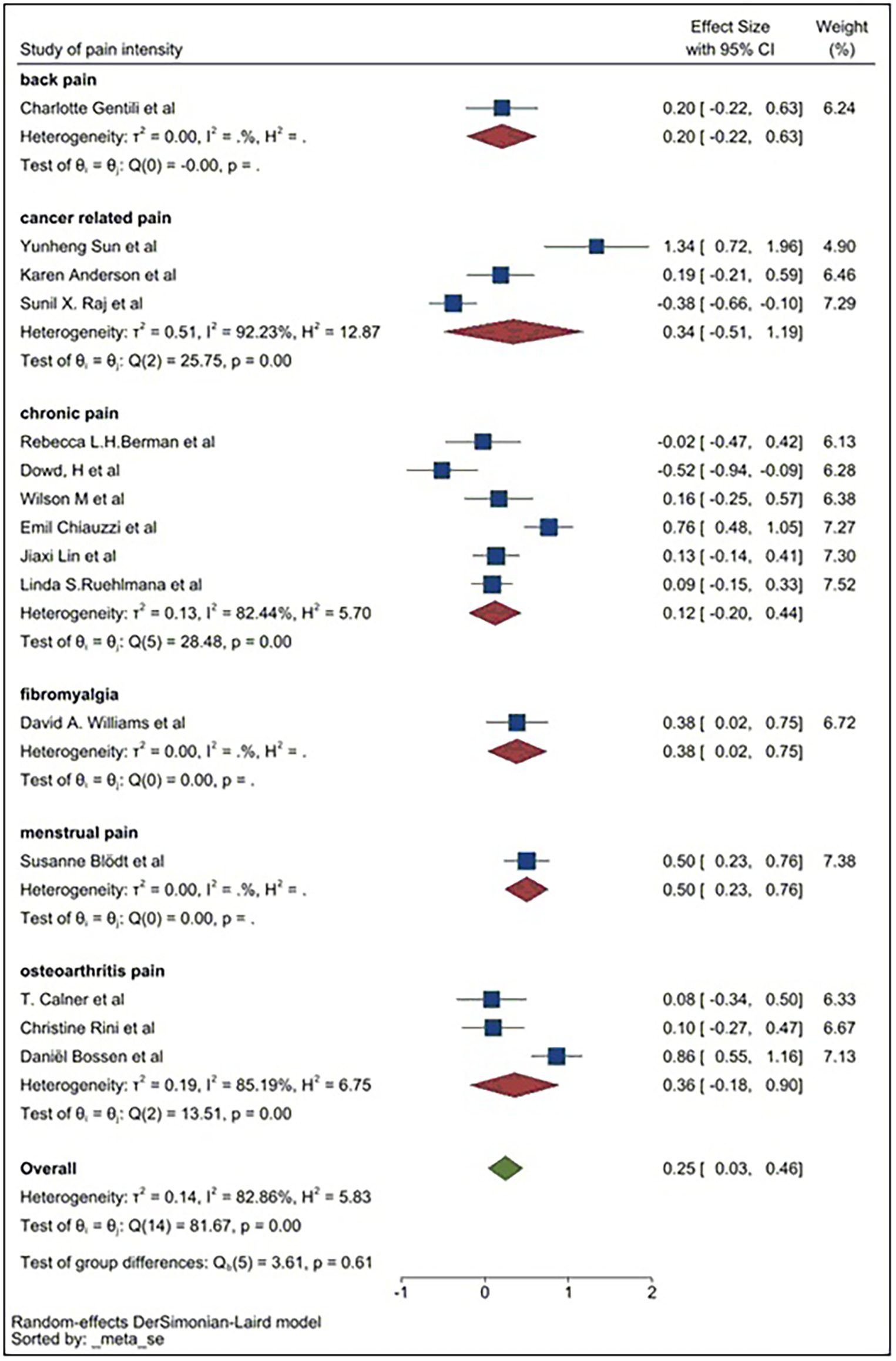 Therefore, showed the mean difference (MD) of the change of score between the two groups, which is the outcome of focus. If is positive, it indicates the treatment was beneficial for patients in improving symptoms of pain. However, if is negative, it indicates the treatment had no effect on improving pain.