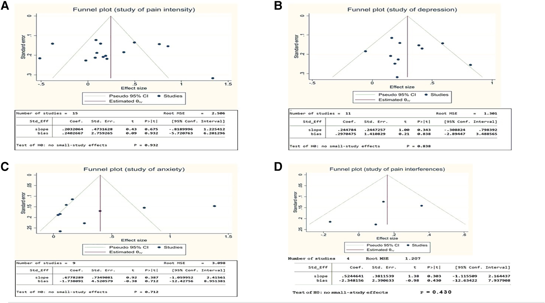BPI (Brief Pain Inventory), NRS (Numeric Pain Rating Scale), PCP-S(Profile of Chronic Pain: Screen) and pain evaluation questionnaires were used to assess pain intensity and pain interference; HADS (Hospital Anxiety and Depression Scale), CES-D (Centre for Epidemiological Studies Depression), BDI (Beck's Depression Inventory), PHQ-9 (Patient Health Questionnaire-9), DASS (Depression Anxiety Stress Scales), GAD-7 (Generalised Anxiety Disorder-7) and STAI (State-Trait-Anxiety-Inventory) were used to assess depression and anxiety; FSS (Fatigue Severity Scale) and MOS (Medical Outcomes Study) sleep scale were used to assess fatigue and sleep. All studies reported the mean and SD of the questionnaires across several timepoints, at baseline and follow-up. The baseline questionnaire score was subtracted from the follow-up questionnaire score to standardize the data and remove the initial effect. Score changes between these two time points reflect the treatment effect. represented the change in the questionnaire scores between baseline (0) and follow-up (1) in the treatment group, which also indicated an improvement of treatments, and represented the change in the questionnaire scores between baseline (0) and follow-up (1) in the control group.