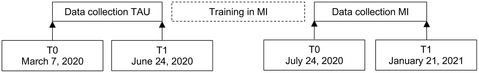 The study used a quasi-experimental design (Figure 1). First, the pre- and post-measurements were collected from visitors receiving TAU. The data collection was then paused, and the participating counselors were trained in MI. The data collection then resumed, continuing until enough data had been collected and every participating counselor conducted at least one chat in the experimental condition. As the two conditions were sampled sequentially, we controlled for the working experience of the participating counselors. Visitors were not aware of the type of treatment they were given. Ethical approval for this study was obtained from the ethics review committee of the VU University Medical Center in Amsterdam (2020.105).