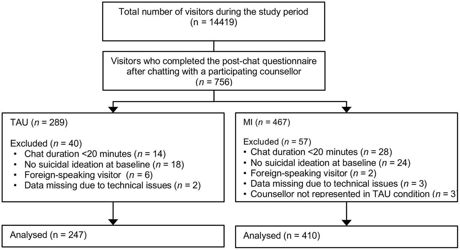 Of the 14419 helpline visitors who visited the helpline during the data collection period, 756 were attended by one of the participating counselors and agreed to fill out the post-chat questionnaire. Figure 2 shows the number of participants who were in or excluded from the two intervention groups. While the last set of counselors were being trained, the first set had already carried out more conversations than expected, resulting in oversampling in the MI group.