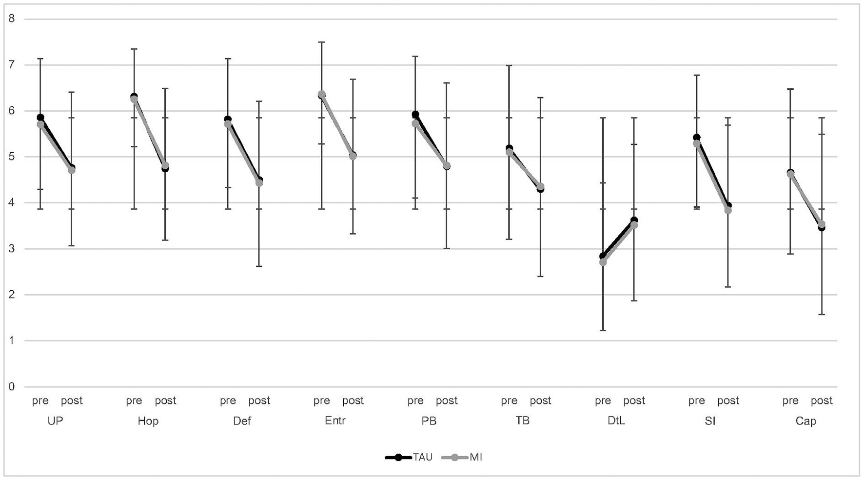 In a pre- and post-test design, visitors of a chat-based suicide prevention helpline received either the Five-Phase Model (treatment as usual [TAU]) or MI. They completed a pre- and post-chat questionnaire on several suicide-related risk factors. Linear mixed modeling was used to estimate the effect of the condition. Furthermore, the treatment proficiency of newly trained counselors was assessed using MI-Scope.