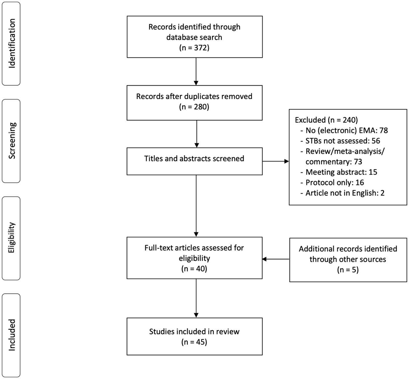 The databases Web of Science (www.webofknowledge.com) and PubMed (https://www.ncbi.nlm.nih.gov) were searched for articles in December 2021, using the search term: “((EMA) OR (“ecological momentary assessment”) OR (ESM) OR (“experience sampling method”) OR (“ambulatory assessment”) OR (“ambulatory monitoring”) OR (“real time monitoring”) OR (“electronic diary”)) AND ((“suicide”) OR (“suicidal”)).” As shown in Figure 1, the search produced 372 results. After excluding duplicate records, 280 remained. Of these, 40 met the inclusion criteria given below. Another 5 articles were identified through alternate sources (i.e., review papers and other articles), resulting in a total of 45 articles for the present review.