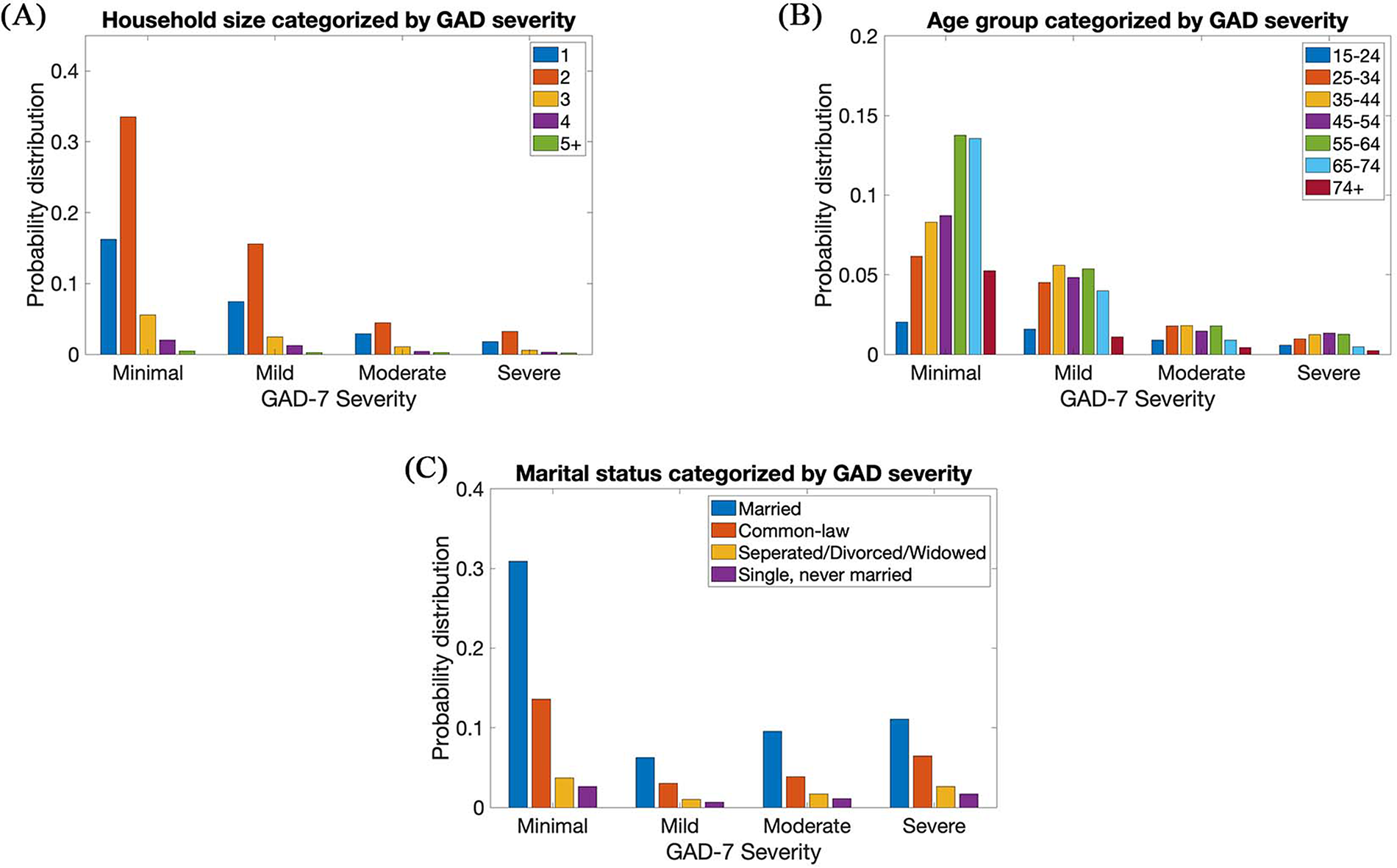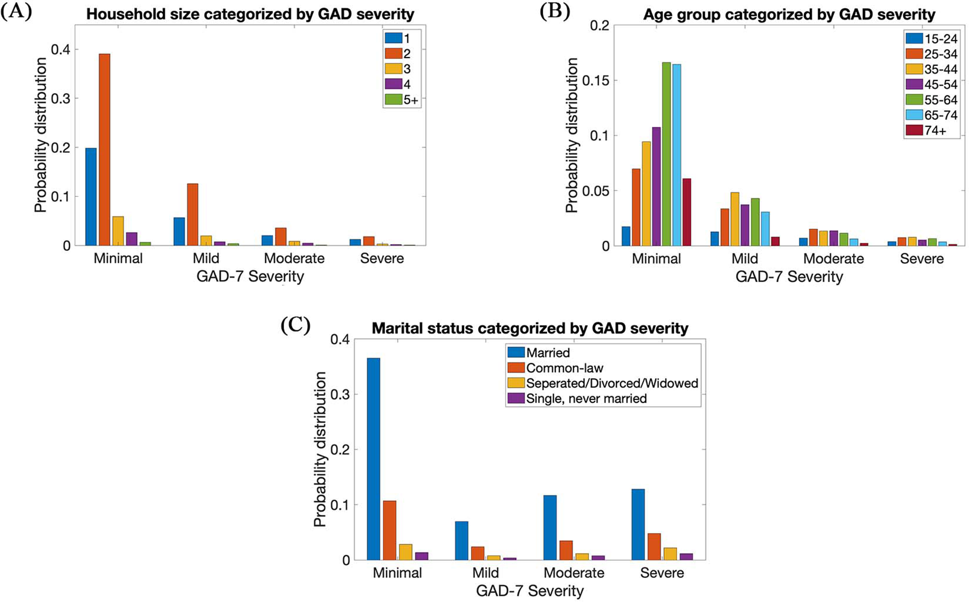 Figure 1 visualizes the probability distribution of the demographics (household, age group and marital status) of participants in the first phase of the pandemic in respect to the severity of anxiety. In the CPSS2 dataset, it is revealed that 76% and 49.4% of the participants were born in Canada and were male, respectively, while the remaining participants were not born in Canada and are female, respectively.