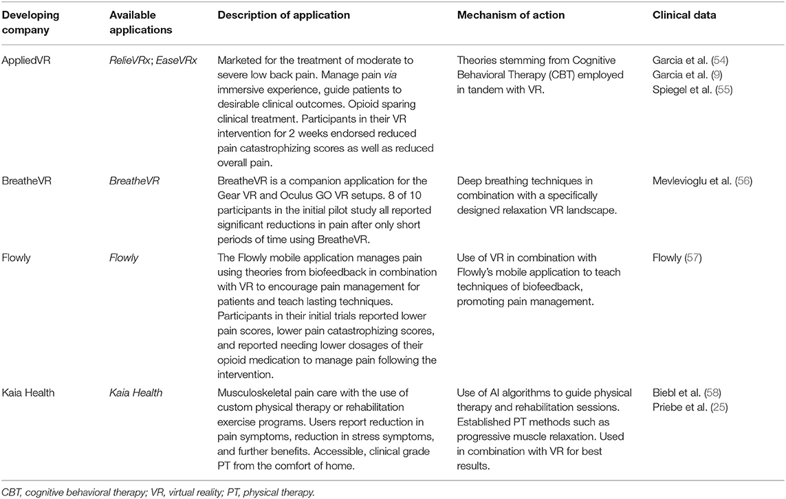 As shown in Table 2, there are several VR and mobile applications currently available for patients and health care providers as tools for improving pain management. RelieVRx has received the FDA authorization (through de novo regulatory pathway) to be marketed as a prescription virtual reality pain treatment for adult patients with chronic low back pain (41). Kaia Health is a mobile app intended for adults with acute or chronic, non-specific musculoskeletal pain, which received class II medical device status in Europe, while is marketed in the US under the FDA enforcement discretion. Flowly VR and biofeedback app is presented as “opioid-sparing pain management device” (www.flowly.world/), but to the best of our knowledge, Flowly has not received the FDA authorization as a medical device, as of writing this mini-review. While digital health technologies are rapidly evolving and expanding, we believe that this article will encourage health care professionals to explore opportunities to integrate digital interventions with pharmacotherapies for improved pain management.