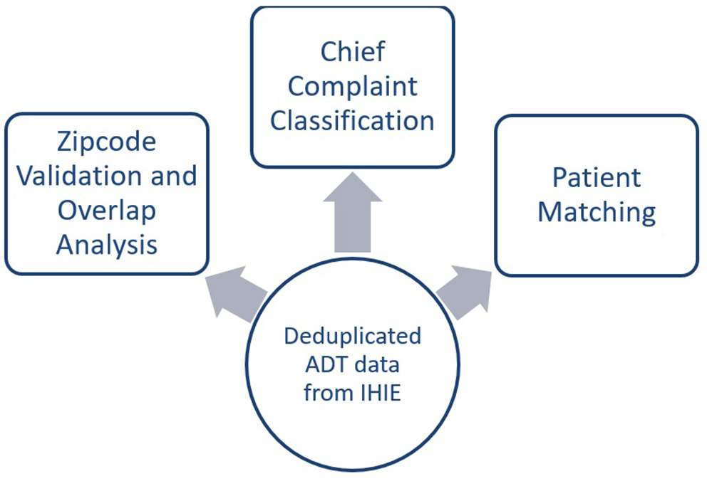 Using the deduplicated and parsed ADT data, a zip code validation and overlap analysis was conducted to determine the coverage areas of the HIEs. A chief complaint classification to determine the reasons for the visit, and deterministic probabilistic patient matching were applied to the data for further characterization of the data (Figure 3). Further explanation of each can be found below.