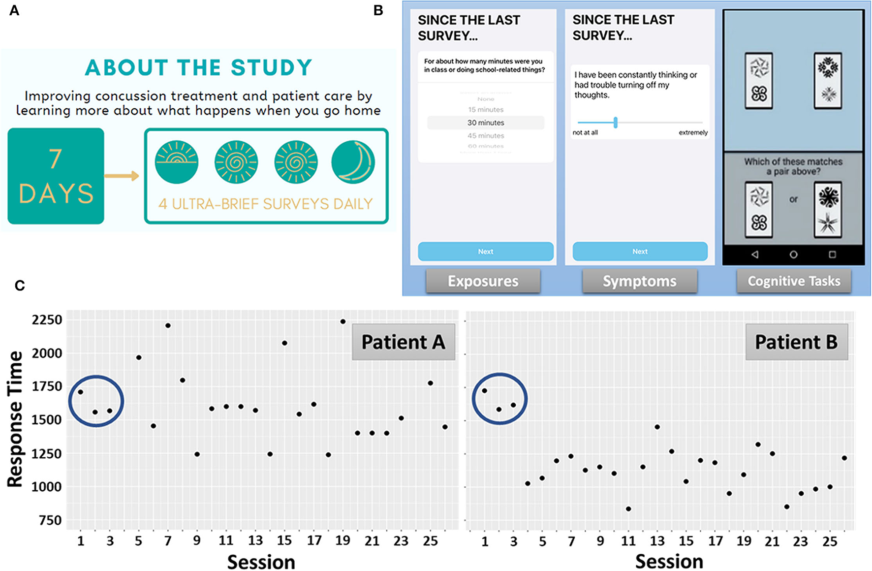 Our approach intends to improve assessment and monitoring by conducting short surveys and ultra-brief cognitive assessments (typically <60 s) on smart phones in a measurement burst design (24–27). By delivering these assessments remotely, and over the course of participants' daily lives, we hope to capture a more accurate representation of patients' everyday experiences including the frequency and duration of exposures to various, potentially symptom-modifying, environments (28, 29). By assessing symptom severity in close temporal proximity to experience, we aim to reduce the influence of biases associated with patient reported outcomes [e.g., retrospective biases (29, 30)]. An advantage of conducting ambulatory cognitive assessments in such an intensive, longitudinal study design protocol is the ability to distribute an equivalent or greater amount of overall testing that would be completed in the clinic, over the course of a week between visits. Separating performance-based assessments from the clinical environment allows patients to complete the assessments in more familiar surroundings (e.g., home or school), increasing the ecological validity of the testing context (24, 27). For example, some patients exhibit significant anxiety related to completing neurocognitive testing for their concussion and discussing their symptoms with the clinician. The administration of performance-based assessments in the patient's daily life and environments may not only reduce anxiety, but possibly increase the clinical accuracy of these assessments and self-reported data from patients. In addition, intensive repeated assessment may help reveal the timecourse of recovery by generating a semi-continuous timeseries of symptom and cognitive performance data.