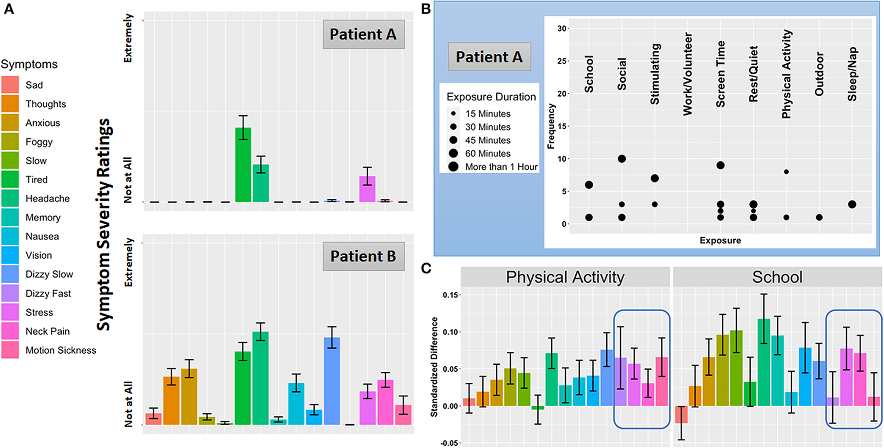 Although the influence of everyday exposures on concussion symptoms and impairments is central to the clinical concussion evaluation, empirical reports on this topic are scant. To date researchers have focused primarily on the exposure to academic (48, 49) and physical activity (50–52) environments. Natural exposure to the academic environment (i.e., attending a day of school with no accommodations for concussion) is linked to increased symptoms and prolonged recovery (48, 53), which has prompted the adoption of a gradual “return to learn” care plan or “pacing” model (54, 55). The usage and frequency of accommodations have been described, but this literature is limited by cross-sectional, cohort studies. Aerobic-based, expose-recover approaches (50, 56) that focus on sub-symptom physical activity is linked to improved concussion outcomes, but these exposures occur during bouts of supervised exercise, not measured in the patient's everyday life. Critically, it remains poorly understood whether the same exposures consistently modify the same symptoms across patients in their natural environment. Precision rehabilitation will require an understanding of which environments and activities affect which patients in which ways. Figure 2C shows how two frequent everyday exposures influence each symptom monitored in MNCH. Standardized differences in symptom severity ratings are plotted for moments where patients report being exposed to physical activity and school activity compared with moments where these exposures are not reported. While physical activity and school activities are associated with increases in overlapping symptoms, the highlighted region shows how feelings of fast dizziness and motion sickness are specific to physical activity, which is consistent with clinical anecdotes suggesting that clusters of symptoms may be closely tied to specific everyday exposures.