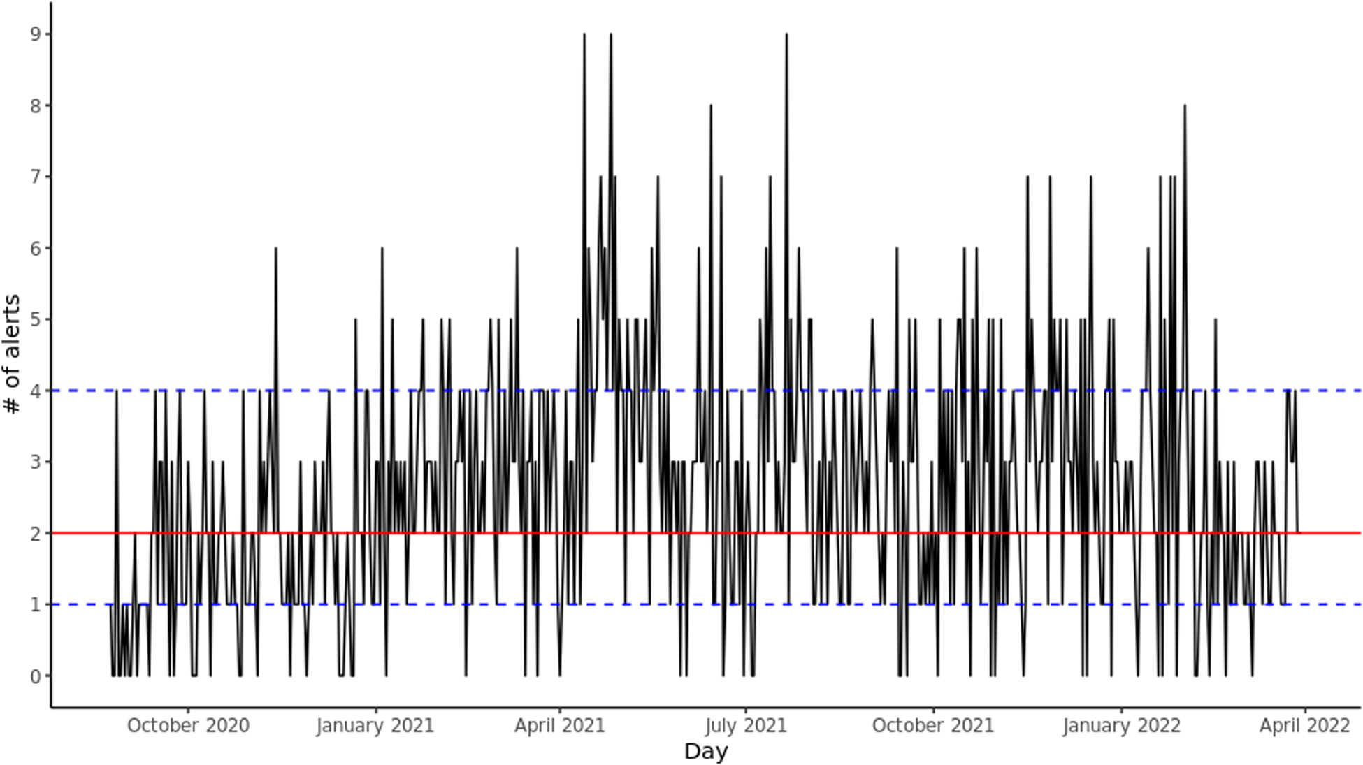 Daily alerts sent by CHARTwatch. The red solid line indicates the median number of daily alerts. The blue dashed lines indicate the 25th quantile and the 75th quantile.