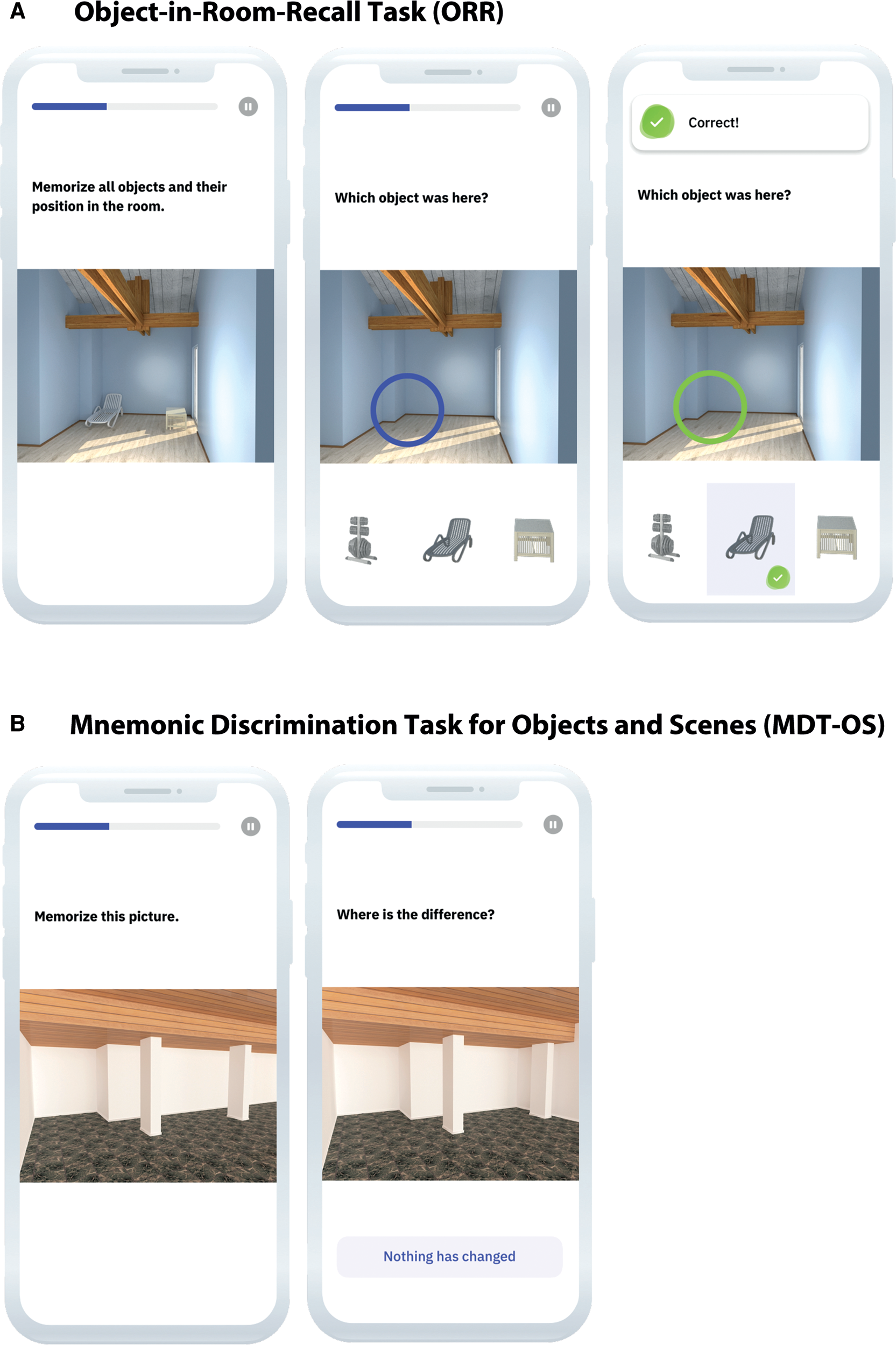 We employed two mobile app-based cognitive tasks building on recent findings on the functional brain architecture of episodic memory and the spatiotemporal progression of AD pathology (24–26). First, the Mnemonic Discrimination Task for Objects and Scenes (MDT-OS) (27), taxing pattern separation as a short-term memory task (28). Pattern separation is the process of discriminating among highly similar but unique pieces of information (e.g., where you parked your car today vs. yesterday). Second, the Object-In-Room Recall Task (ORR-LDR) was developed to tax pattern completion (29), i.e., the ability to retrieve a stored memory based on a cue of incomplete information. The ORR-LDR was implemented as a one- to three-day long-term delayed recall task, consequently assessing long-term memory.