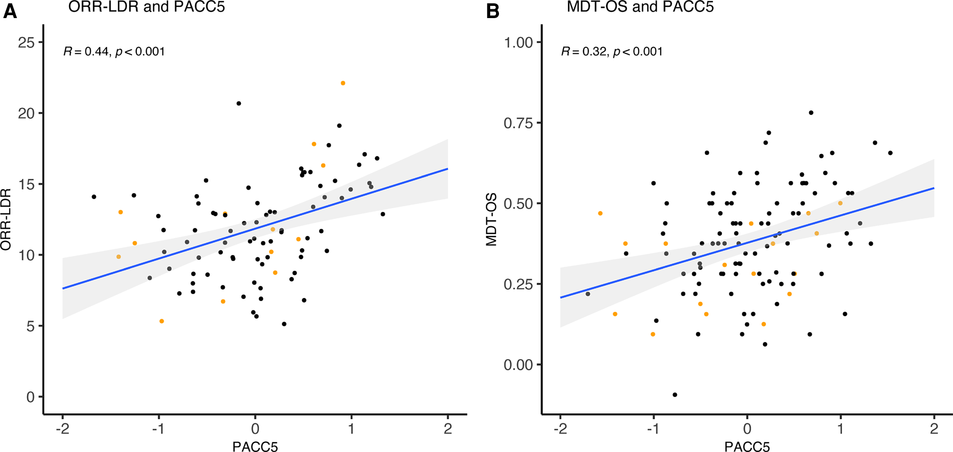 The PACC (32) is a cognitive composite developed to be sensitive to AD-related cognitive impairment and consists of episodic memory, executive function, and global cognition measures. We created a PACC5 (44) cognitive composite using an average of z-scored measures of RAVLT delayed recall (included twice), MMSE, Digit-Symbol-Test, and Word fluency animals. PACC weighs heavily on aspects of episodic memory, and PACC5 additionally incorporates elements of semantic memory, i.e., category fluency.