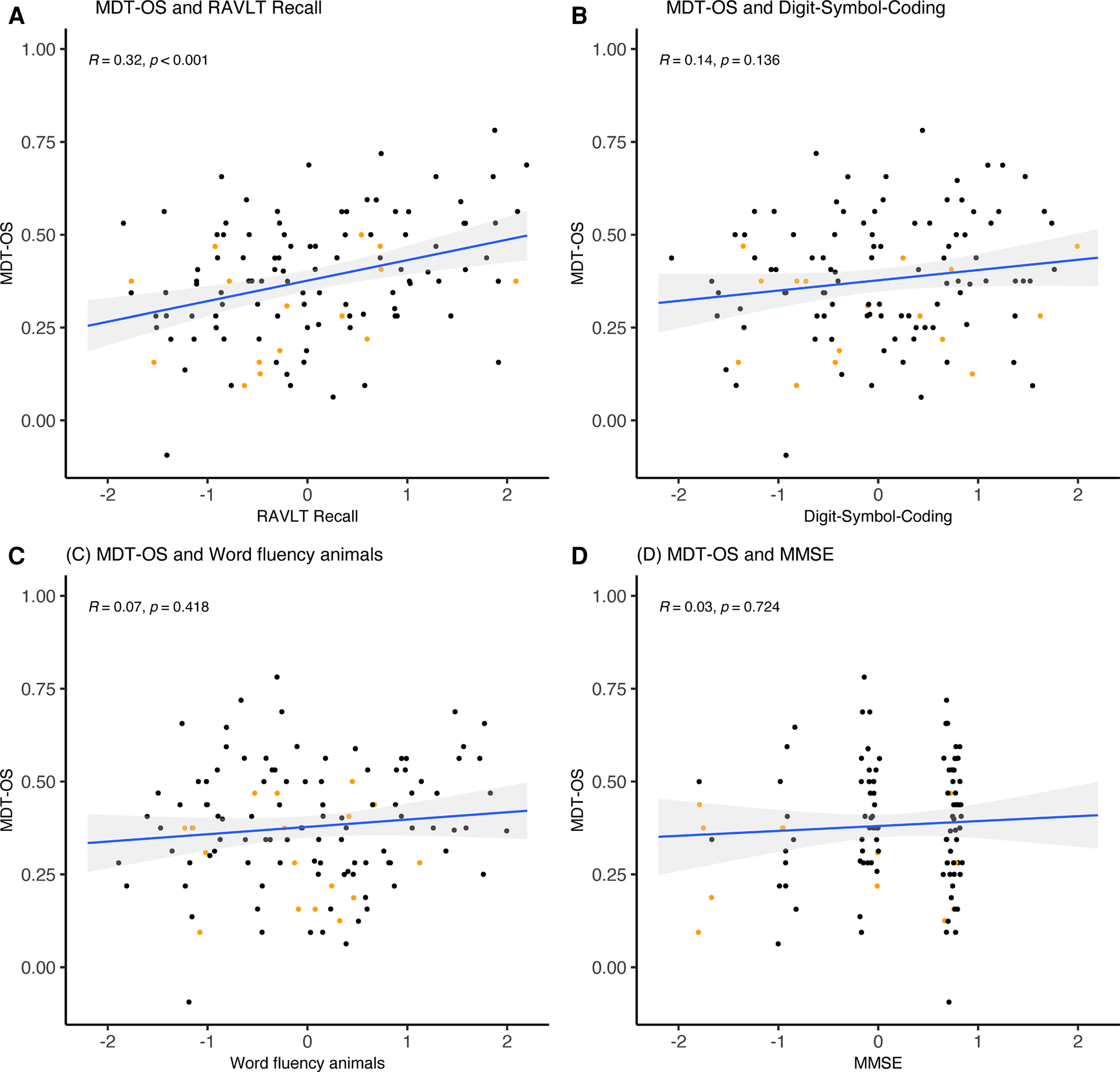 The associations between the mobile app-based cognitive measures and sex and years of education were investigated using multiple linear regression models. Years of education was not associated with task performance on any of the tasks (ORR encoding, β = 0.02, p = .790, 95% CI, −0.10, 0.14; ORR-LDR, β = 0.08, p = .315, 95% CI, −0.08, 0.26; MDT-OS phase 1, β = 0.00, p = .072, 95% CI, −0.00, 0.02; MDT-OS phase 2, β = 0.00, p = .407, 95% CI, −0.01, 0.01). Likewise, sex was not associated with task performance on any of the tasks (ORR encoding, β = −0.39, p = 0.402, 95% CI, −1.31, 0.53; ORR-LDR, β = 1.02, p = .153, 95% CI, −0.38, 2.43; MDT-OS phase 1, β = −0.00, p = .963, 95% CI, −0.07, 0.07; MDT-OS phase 2, β = −0.02, p = .497, 95% CI, −0.09, 0.04).