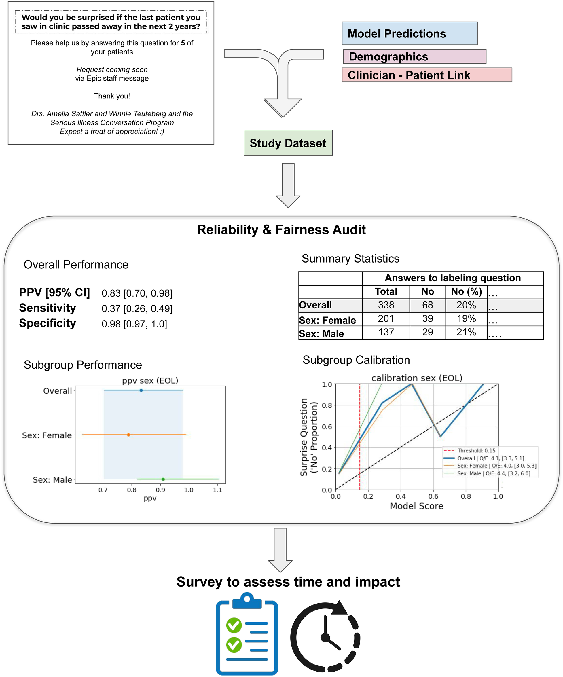 Overview of audit process. Results and plots listed are for the Epic End-of-life Index Low Threshold for Primary Care. The “labeling question” under Summary Statistics is “Would you be surprised if this patient passed away in 2 years?”.