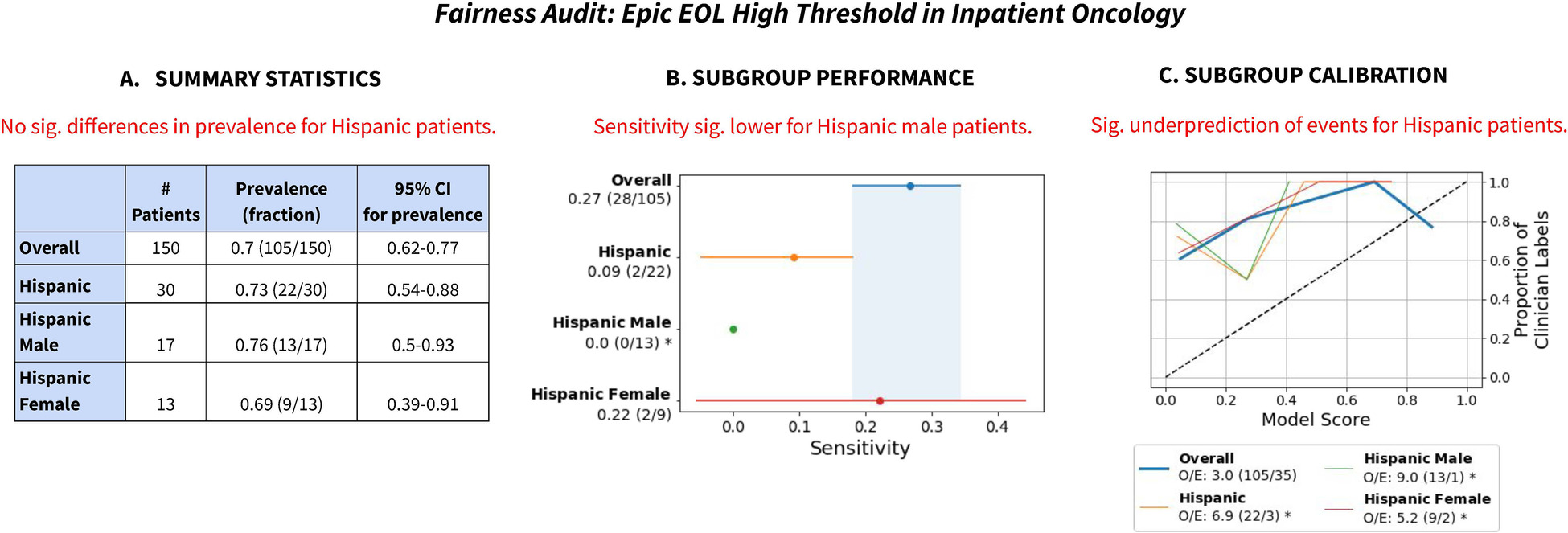 We presented the results of our audit to decision makers in Primary Care (co-authors AS, WT), Inpatient Oncology (co-authors ARK, WT, SC, KR, MG), and Hospital Medicine (co-authors SW, LS, RL), in a separate presentation for each setting. Each presentation first gave context to the audit, including sharing previous findings that AI models have been unreliable (5, 48) or unfair (4), as well as that race/ethnicity data in the EHR is known to have inaccuracies (33). Then, we shared the summary statistics, model performance, model calibration, subgroup performance and subgroup calibration.