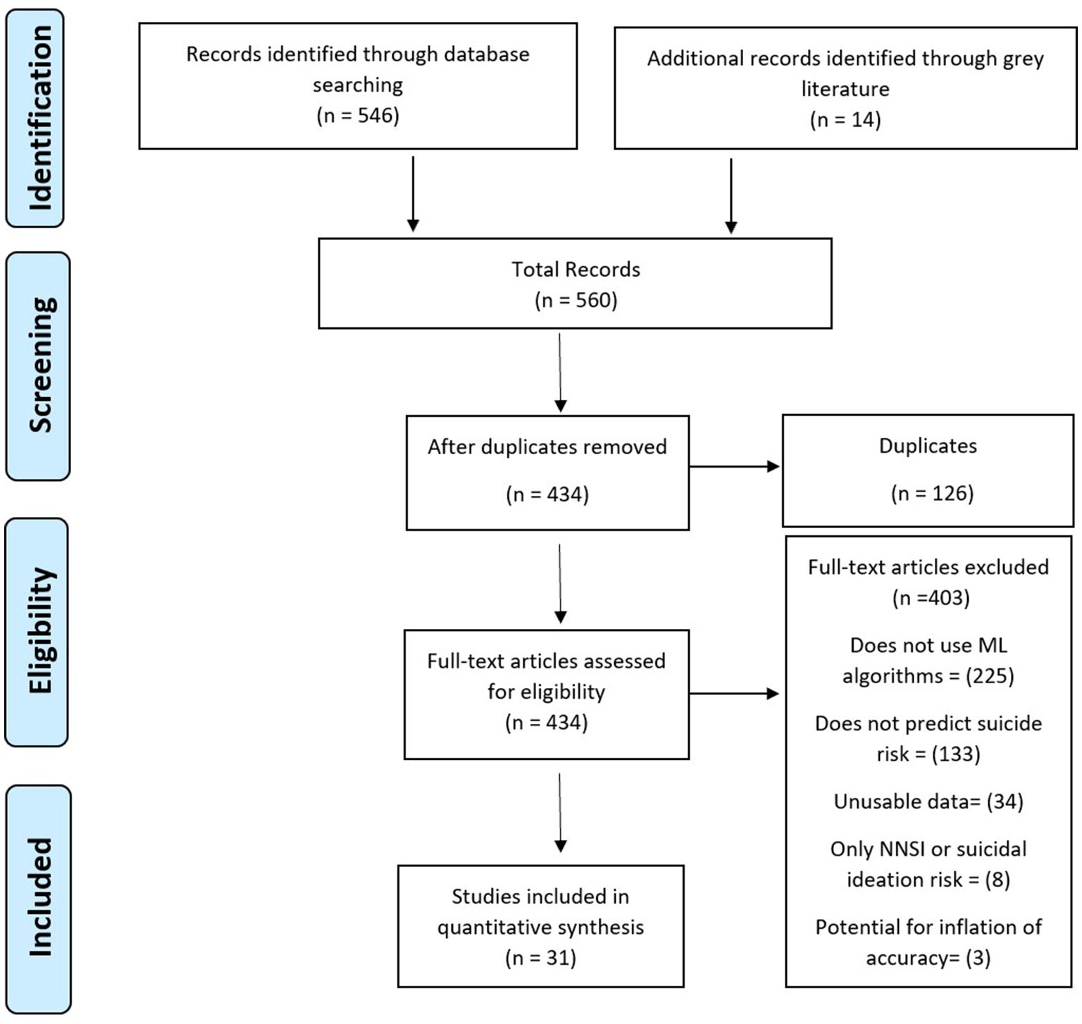The initial search yielded 560 studies. Figure 1 shows the literature search results. After duplicates were removed, 434 studies underwent full-text screening by the first author. In total, 403 articles were excluded: 225 that did not use algorithms, 133 that did not predict suicide risk, 34 that did not contain adequate data, eight that focused only on self-injury or suicidal ideation, and three that were suggested to be overestimated given the type of algorithm and validation methods used.