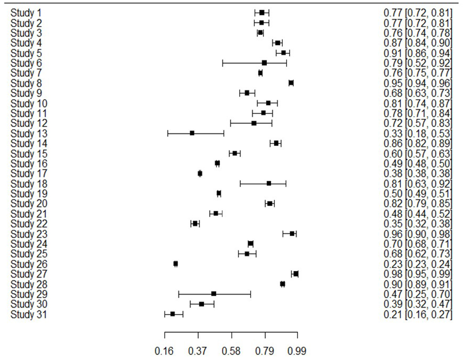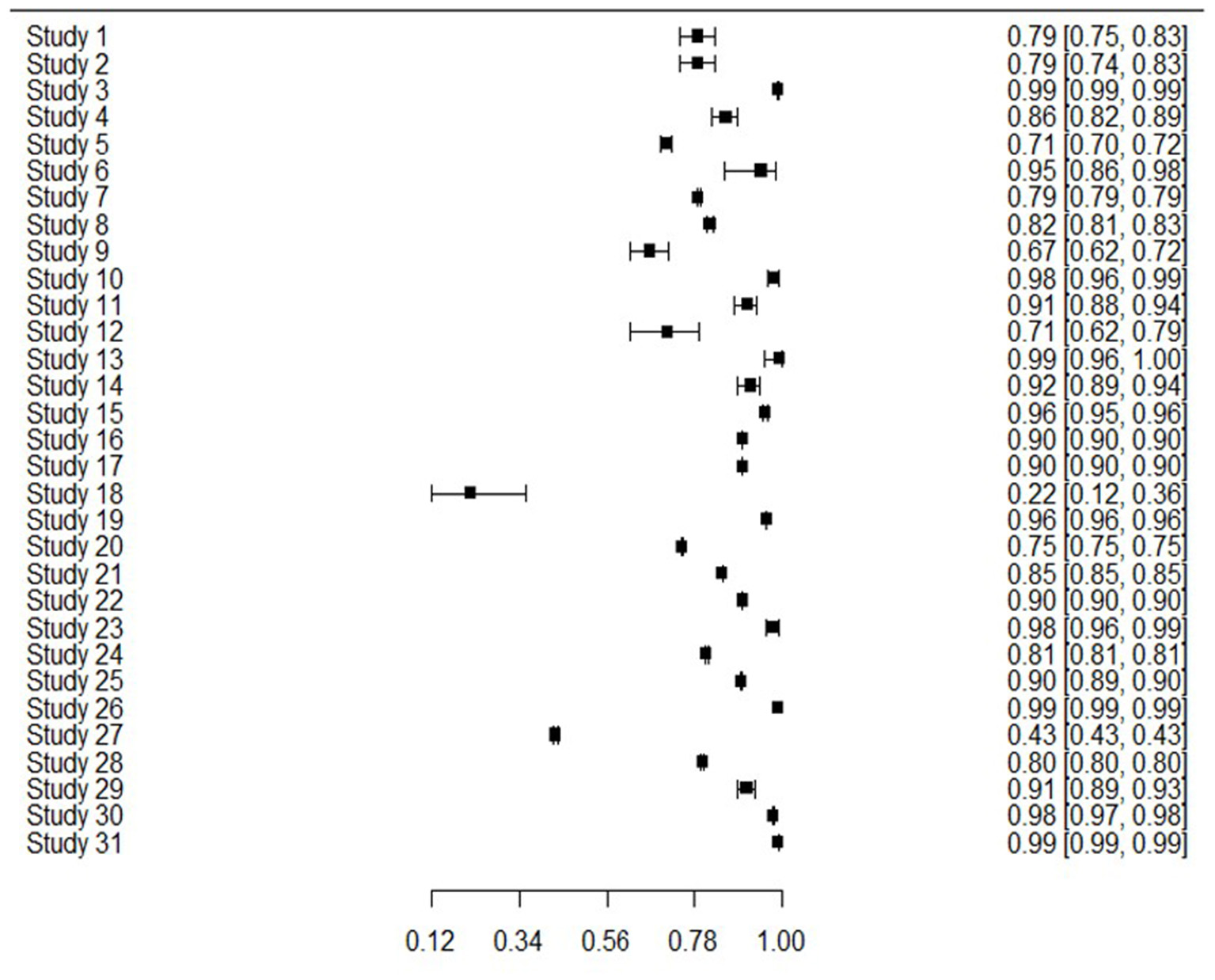 The 31 studies were able to be used in the meta-analysis as informed by the combination of sensitivity and specificity to produce bivariate outcomes and an AUC. Sensitivity or true positive rate, is the ability to identify those with the outcome of interest, whereas specificity or true negative rate, is the ability to correctly identify those without the outcome of interest. Figure 2 presents sensitivity for all studies, showing that generally sensitivity varied widely from 0.21 to 0.94, but was mostly in the 0.70 s. Specificity values are shown in Figure 3, revealing a range from 0.22 to 0.99, but most often high in the 0.90 s, with low scores being few. It is important to note that for events with low base rates such as suicidal behaviors, specificity is not always a useful indicator of accuracy. However, such is an inherent limitation in research of rare events.