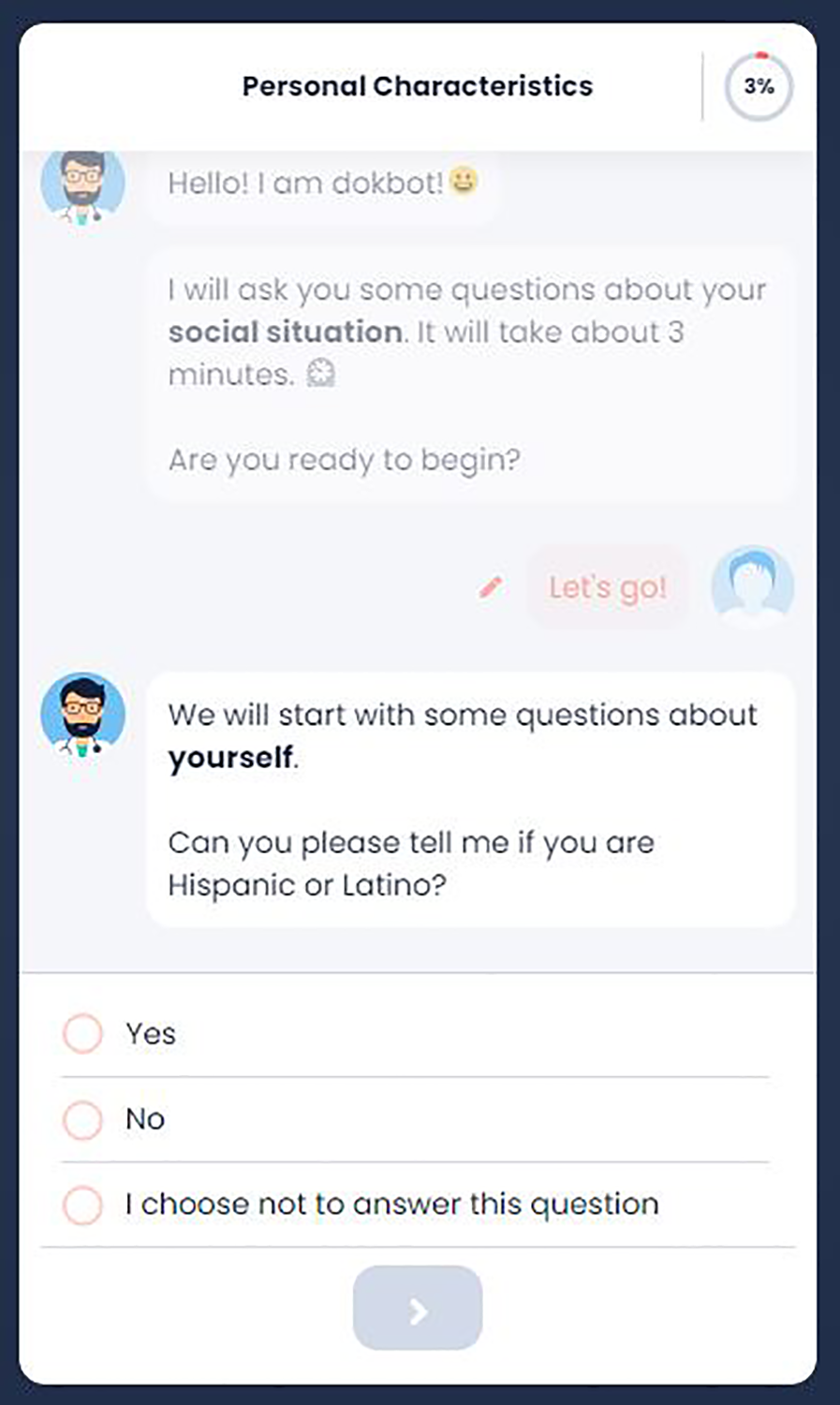 Dokbot is a free, secure (compliant with Health Insurance Portability and Accountability Act of 1996), simple chatbot developed to collect healthcare data in an interactive way, mimicking human-to-human interaction. Dokbot is a browser-based application that does not require downloads and is designed with a mobile-first approach, which is particularly important for patients as they are most likely to access the internet through a smartphone (22, 23). Dokbot can be customized with various names, avatars, languages, and personalities appropriate to user characteristics (e.g., age, gender, etc.) and can be integrated within different health information technology (HIT) systems (24).