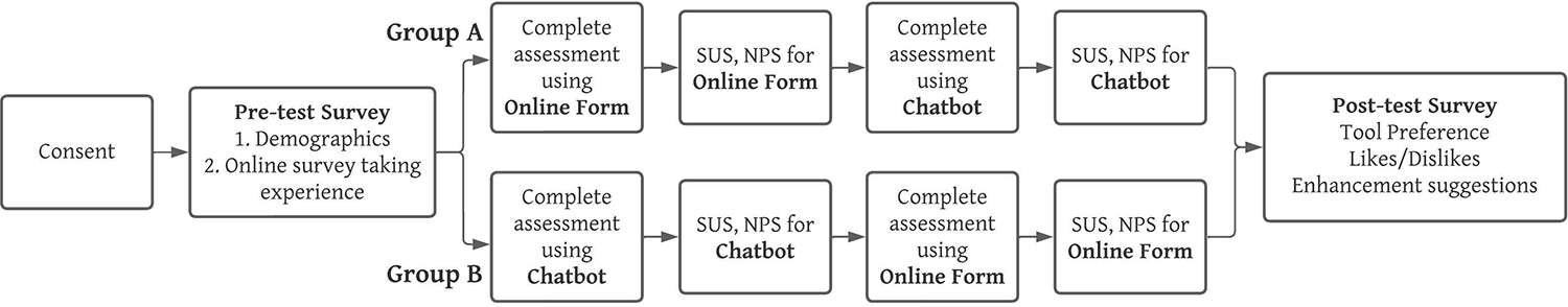 This study used a counterbalanced, within-subject experimental design to conduct a large-scale, unmoderated study comparing the usability and user experience of completing a health assessment using a chatbot (i.e., Dokbot) and an online form (i.e., REDCap) (11, 21).