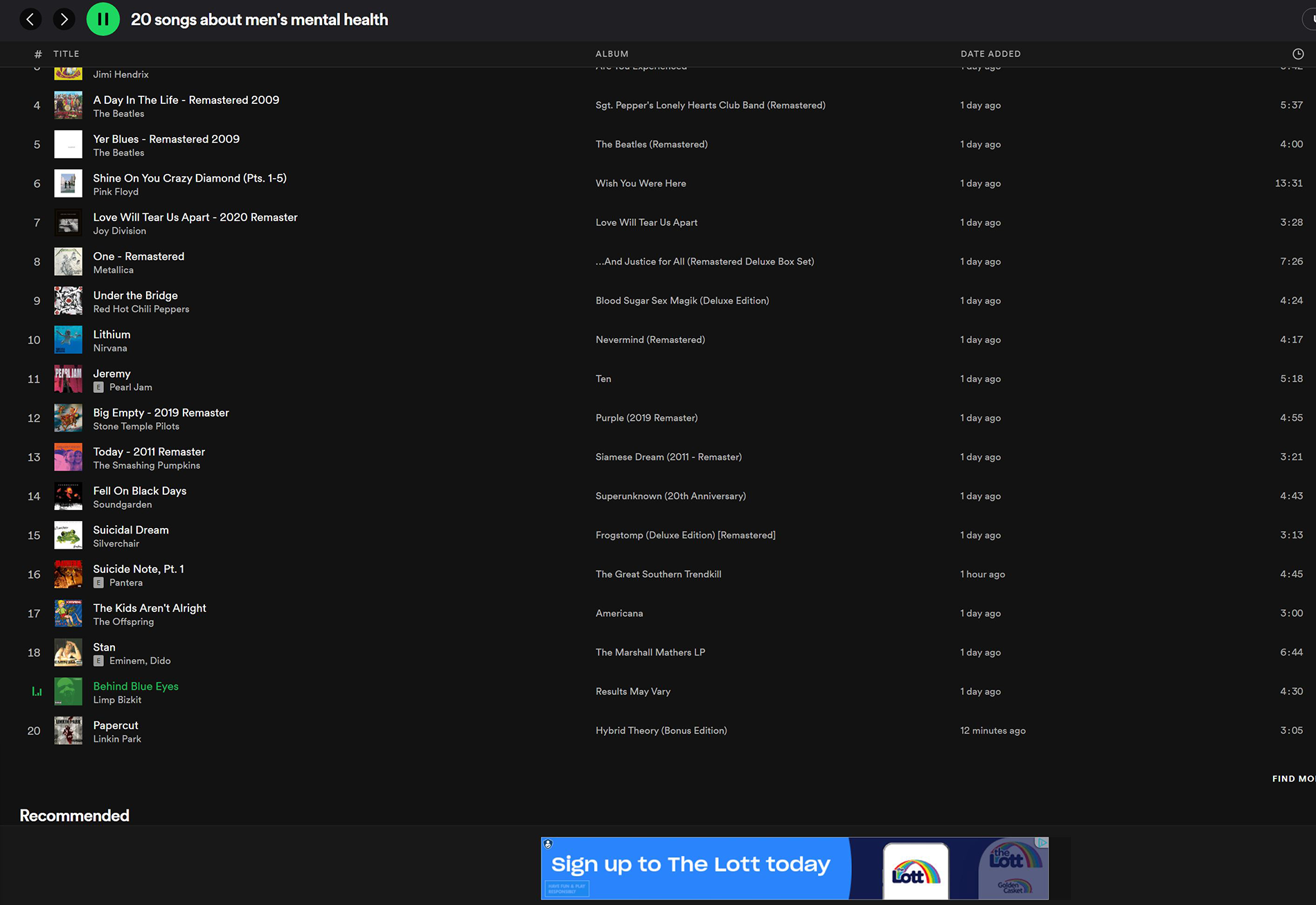 Spotify playlist with a branded image advertisement. Balcombe, L. (2022). Spotify playlist: “20 songs about men's mental health”. Sourced from: https://open.spotify.com/playlist/7yvyppDtEBwf6BDvnTwDNK?si=d38a55a2217f41aa (viewed on 20 May 2022).
