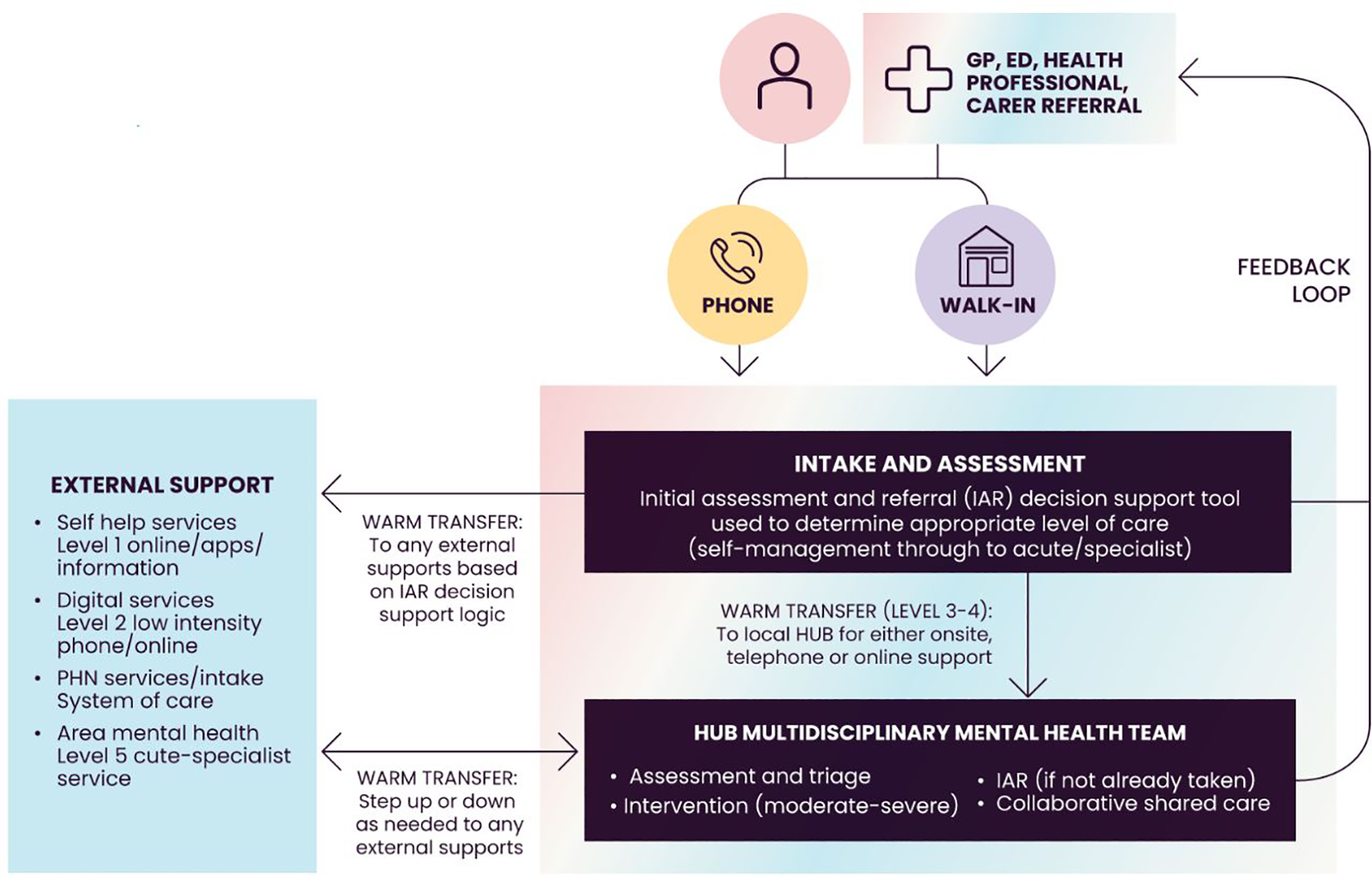 Head to Health access procedures for health care providers. Australian Department of Health (2019). National Initial Assessment and Referral for Mental Healthcare Guidance. Sourced from: https://headtohealthvic.org.au/for-health-care-providers/ (viewed on 26 August 2022).