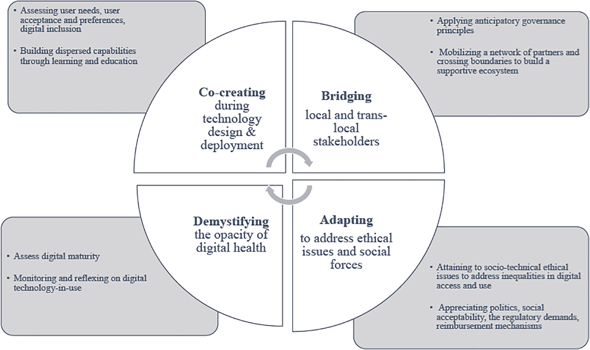 The papers' contribution can be grouped into four themes, which highlight key non-technology related aspects of digital health adoption (Figure 1): (a) Co-creating through digital inclusion and user engagement. (b) Bridging local and trans-local stakeholders including partners from the wider economy and the private sector. (c) Adapting to ethical issues and social forces, beyond technical and clinical aspects, such as public (mis-)perceptions, professional and organizational dynamics, regulatory elements, as well as issues of cost and reimbursement. (d) Demystifying the opacity (clinical, operational) of digital health applications and assessing digital maturity in practice.