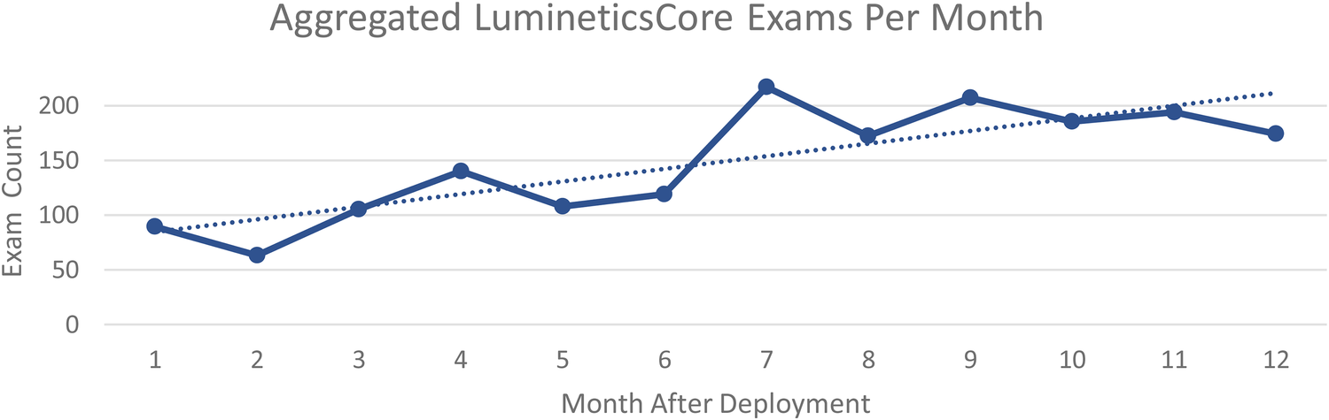 After 1 year, the aggregated number of exams increased from 89 per month at initial deployment to 174 per month across all sites. Figure 1 shows aggregated health center exam performance 12-months after initial launch. The trend line shows the sustainable and ongoing success of implementation of LumineticsCore.