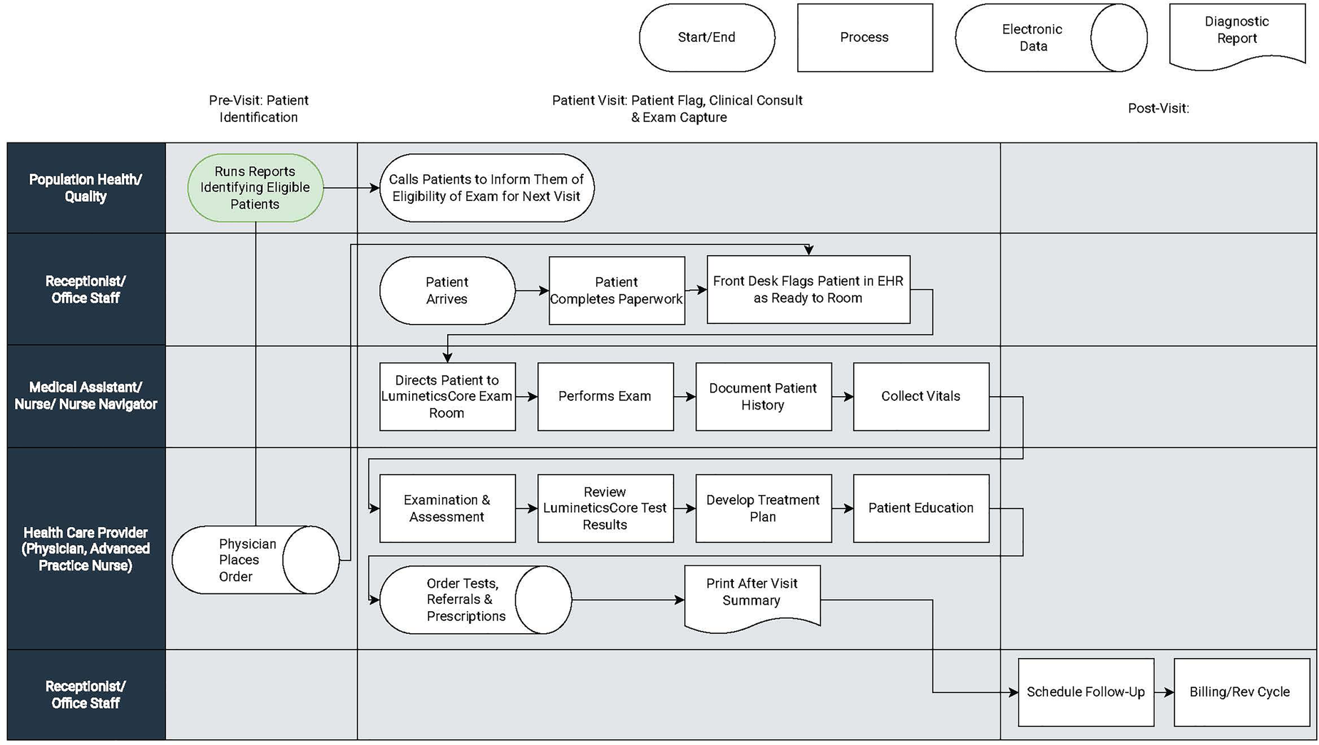 | Role | Patient identification | Exam capture | Post-exam results/referrals |