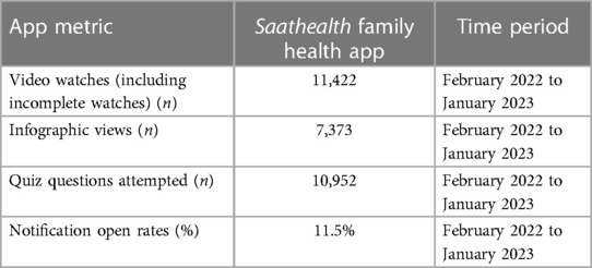 In the Saathealth children's health app, users received new content daily in multiple, consumable formats that included videos, infographics, notifications, and interactive quizzes. During the time period of July 2019 to September 2019, the Saathealth children's health app had 131,618 video watches (including incomplete watches), 12,501 infographic views, and 180,449 quiz questions attempted, with a notification open rate of 26.7%. In the family health app till January 2023, we have delivered 1,133 content pieces of new content related to family health topics in the form of animated videos, explainer videos by health experts, quizzes, dynamic infographics with voiceovers, notifications, creatives for lead generation campaigns, and social media reels. 8,517 users engaged with at least one content piece. Table 2 presents content consumption data on the Saathealth family health mobile app.