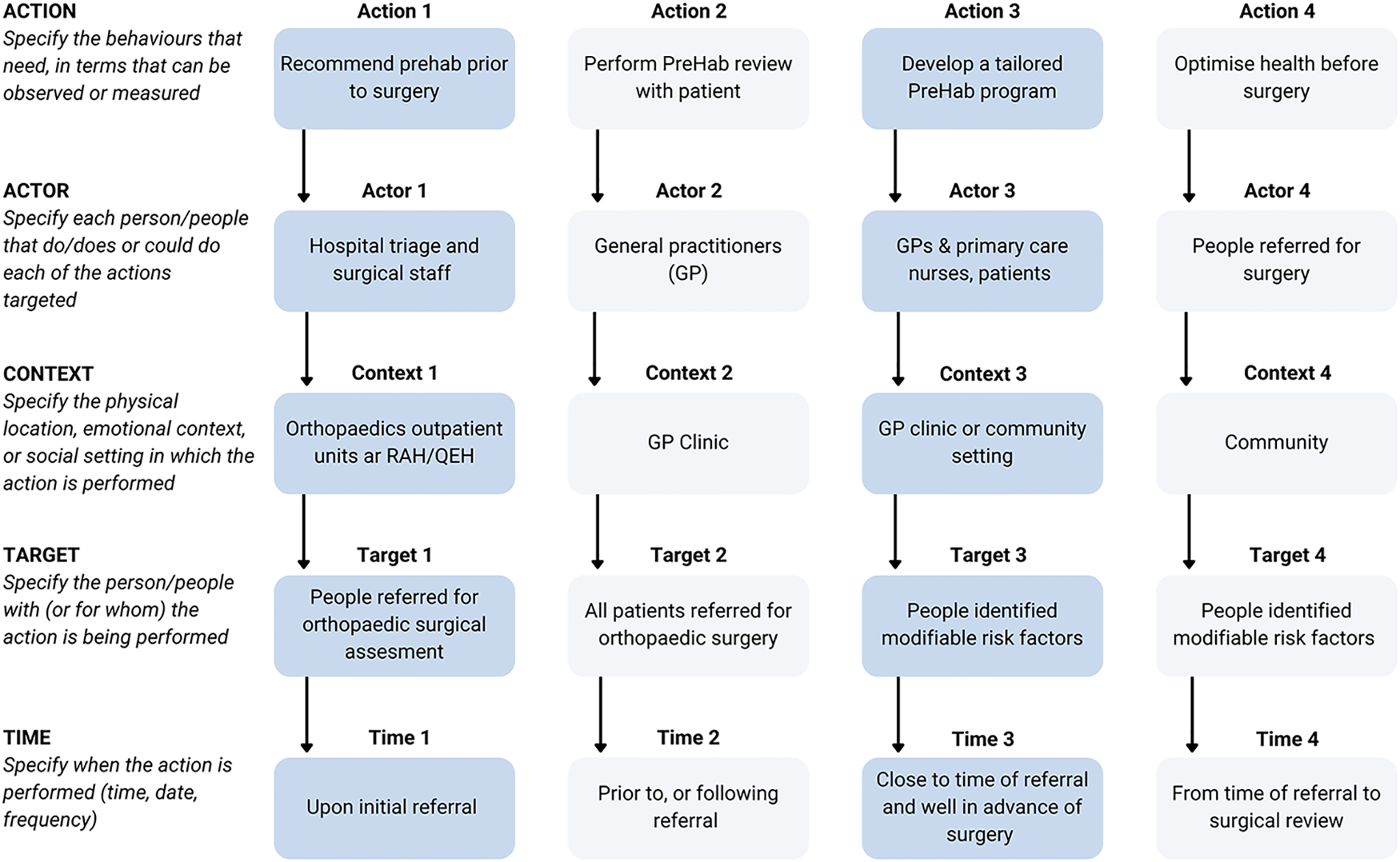 The Action, Actor, Context, Target, Time (AACTT) Framework (14) was used to identify the desired behavioural changes required to improve consumers health preoperatively, and inform stakeholder engagement (Figure 2). The Knowledge to Action (KTA) framework (15) was used to conceptualise and guide the process of moving evidence into practice which we aimed to achieve in this study (Figure 3).