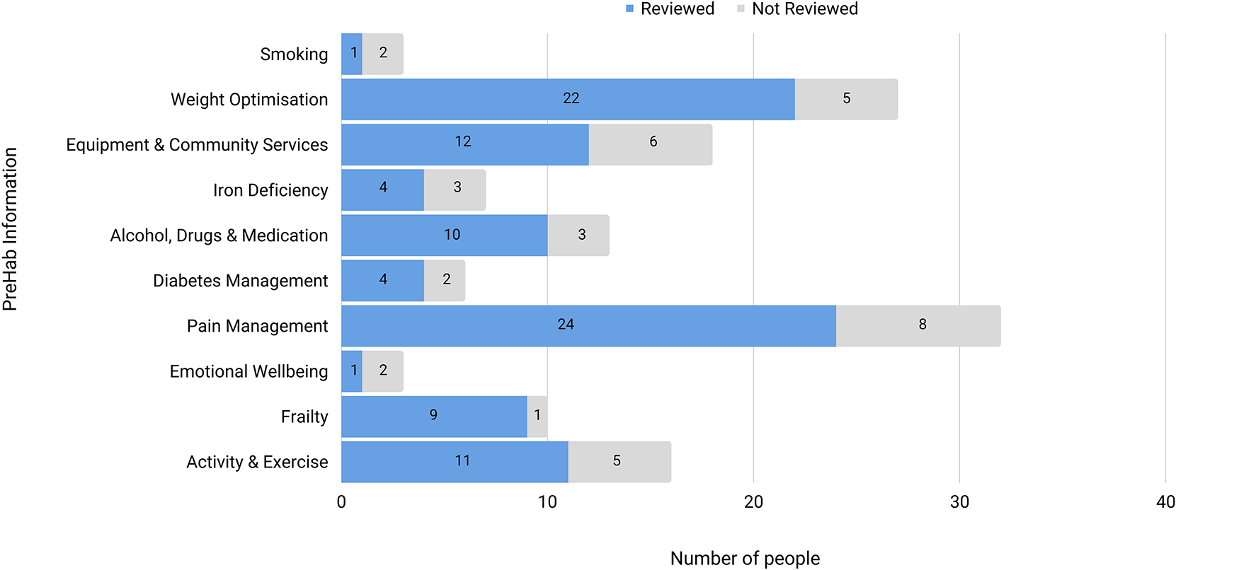Prehabilitation (prehab) is an intervention that aims to identify and address modifiable risk factors (smoking, anaemia), improving aerobic capacity, nutritional balance, and psychological status before surgery (7). Small, randomised control trials of limited/single components of prehab suggest a large reduction in complications [41% (95% confidence interval [CI], 15–59, P = .01) for smoking cessation] (8) for prevention of postoperative complications., and good return on investment with shorter length of stay, lower hospital costs and reduced healthcare utilisation post-discharge (7). However, no-one has reported on the feasibility, acceptability, and/or outcomes of a ‘global’ prehab approach, rolling all modifiable risk factors into a proactive screening approach.
