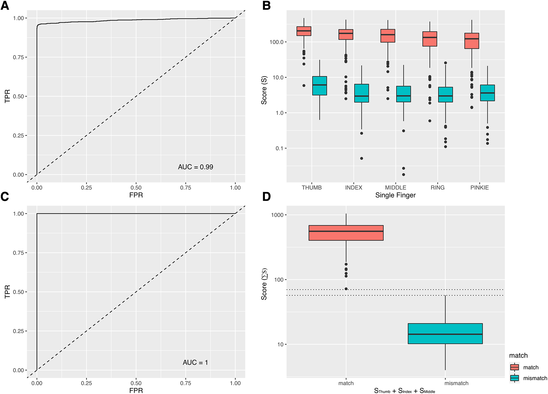 We aimed to recruit a minimum of 200 individuals, generating more than 1,000 fingerprints to include in our initial evaluation. Linear regression was used to identify skin characteristics that were associated with changes in the average score among the true positive template pairs. The Receiver Operator Characteristic (ROC) was used to assess the overall performance of the matching algorithm and to identify suitable threshold values for determining matched and unmatched classifications. We used the area under the ROC curve (AUC) as a generalised indicator of the matching algorithm's performance. The AUC value is an indicator of the aggregate performance of a binary diagnostic assay across all possible classification thresholds. AUC = 1 indicates a perfect classifier and AUC = 0.5 indicates a classifier that performs no better than a random coin-toss. AUC provides a simple way to compare the performance of two diagnostics in a way that is independent of scale and threshold values, and when comparing several classifiers, the one with the higher AUC is generally the more performant assay. In order to determine whether the accuracy of matching could be increased by using more than one finger in the classifier, we calculated a multi-finger score (∑S) by summing the values of S from two (thumb, index), three (thumb, index, middle), four (thumb, index, middle, ring) or five (thumb, index, middle, ring, pinkie) fingers. ROC analysis was performed and the optimal assay was chosen on the basis of maximising the AUC whilst minimising the number of fingers used to perform the test. All analysis was performed in R v4.2.0.