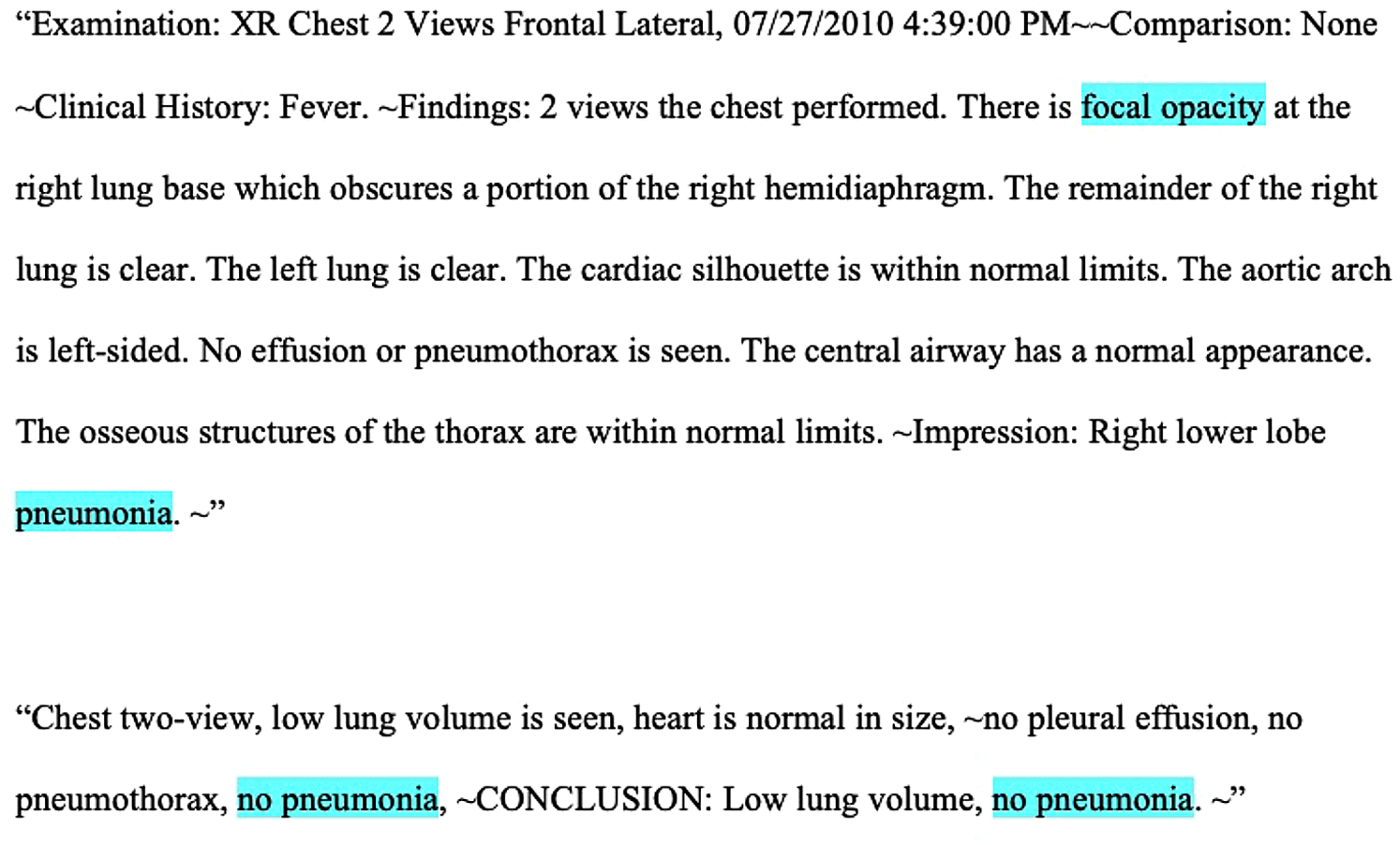 Highlighted examples of positive and negative chest radiograph reports, respectively.