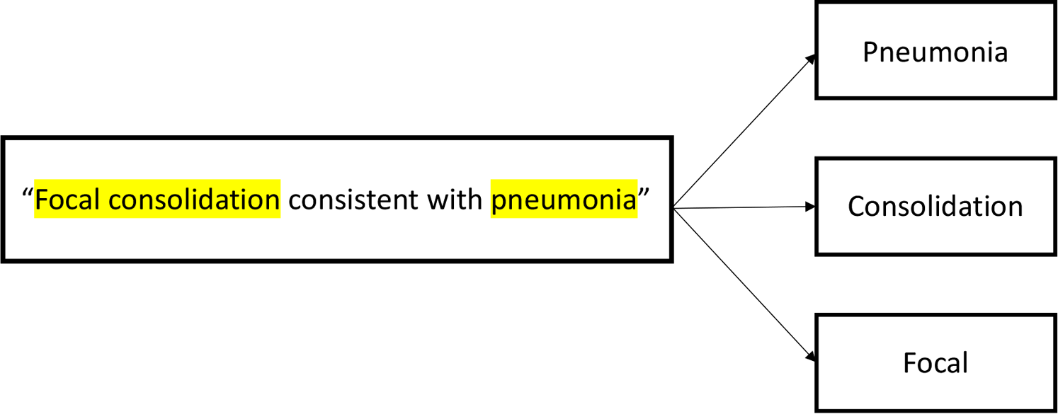 In order to train the models, three content experts (NR, SR, AF) reviewed 200 randomly selected CXR reports and generated a mutually agreed upon list of the most frequently utilized keywords used to denote pneumonia (Table 1). Negative combinations of the keywords (e.g., “no infiltrate”) were also included to represent the absence of pneumonia. These keywords were then converted into tokens, (i.e., broken down into their most basic components) (Figure 1), and were then used to train models.