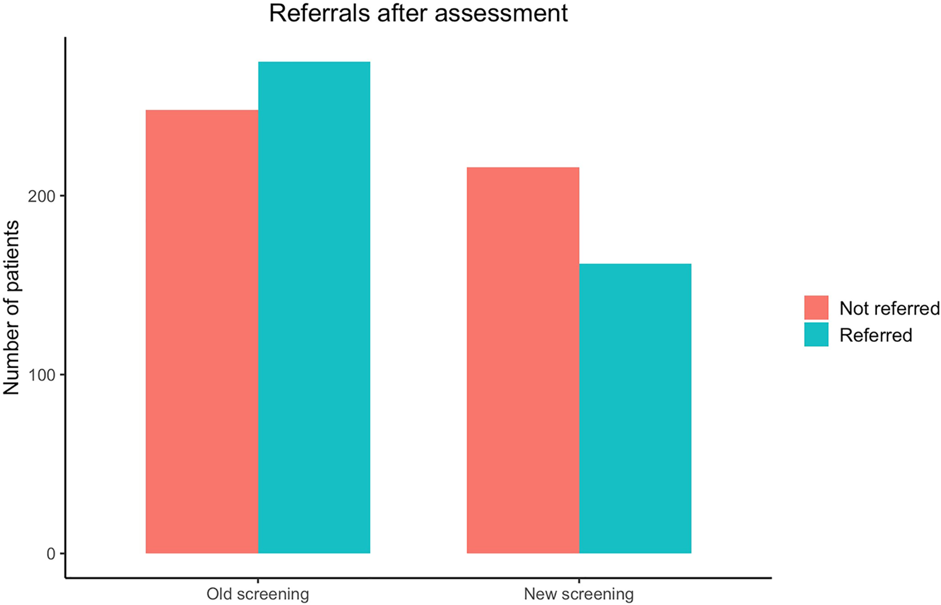 The new online screening tool for Internetpsykiatrien was implemented on November 8 2019. Data from 6 months prior to implementation (May 8 2019–November 7 2019) and 6 months after implementation (November 8 2019–May 8 2020) were extracted from the clinic to analyze the effects of the screening tool.