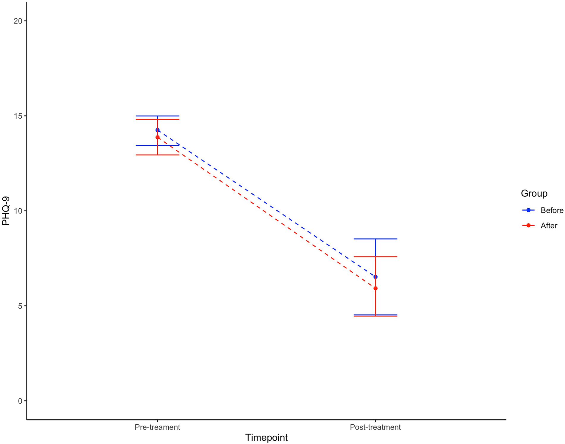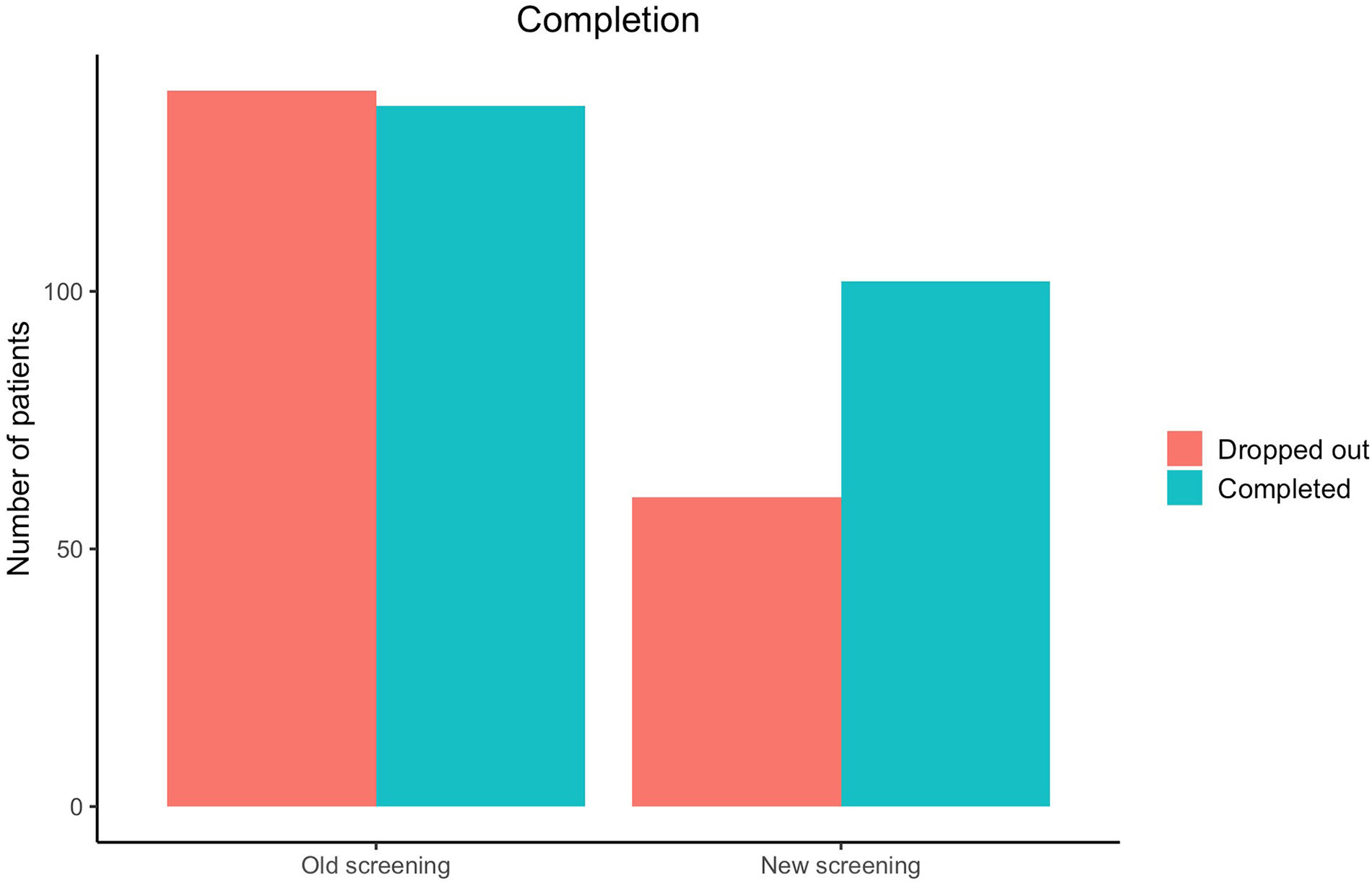 We proposed this hypothesis based on the assumption that in the “before” setting, part of the sample may have been less suited for this specific treatment style and method, meaning that even if they completed it, they may have benefitted less. The theoretical foundation for this is that therapy may be less efficacious in cases of misdiagnosis, or if patients are not compliant ({Kingdon, 2007 #38}{Howes, 2022 #36}), wherefore sharpening the inclusion process may minimize the risk of including persons who will not benefit from treatment.