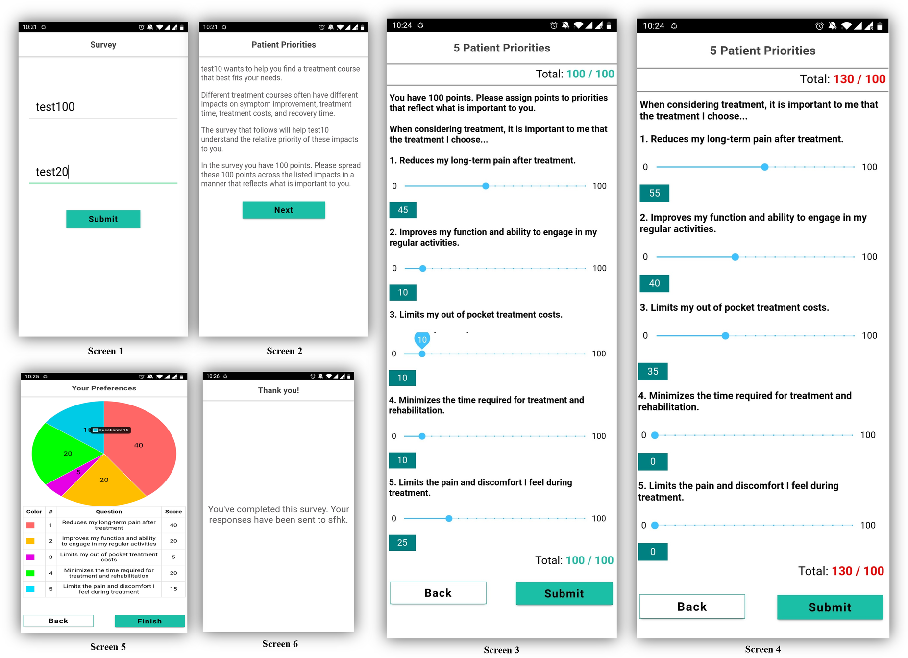 Screen 1 allows the test subject to be identified as an anonymous participant of the study. Screen 2 explains the DW task to the user. Screens 3 and 4 illustrate the user's direct weighting interaction. We utilized the previously identified patient preferences and adopted a 100-point bucket weighting design in which the patients were required to distribute and assign a total of 100 points into five treatment preferences. Patients were not able to assign more or less than 100 points across domains (Screen 4). Screen 5 is a pie-chart visual confirmation of the assigned weights and screen 6 is a confirmation of preference survey completion.
