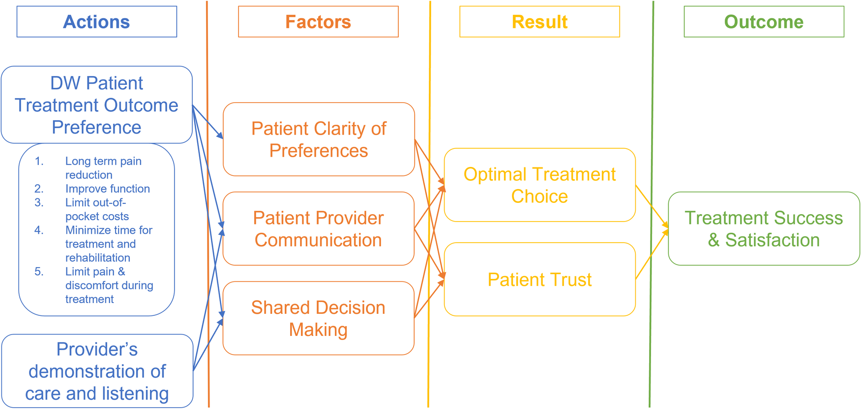 We used grounded theory (Figure 2) hypotheses to guide our analysis. The hypotheses include A. Allowing patients to express their treatment outcome preferences using a DW collection technique prior to their first visit for an orthopaedic condition induces and increases clarity of thought about the treatment outcomes they wish to achieve., B. The treatment outcome domain identified in our primary research presents the optimal set of patient preferences for their treatment outcomes., and lastly, C. Collection of patient's treatment outcomes preference improves the patient-provider communication, shared decision making and patient satisfaction on treatment decisions. We developed our interview guide based on these hypotheses and utilized this theoretical framework to guide the thematic analysis of the interview data.
